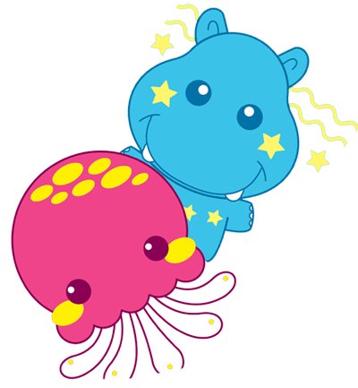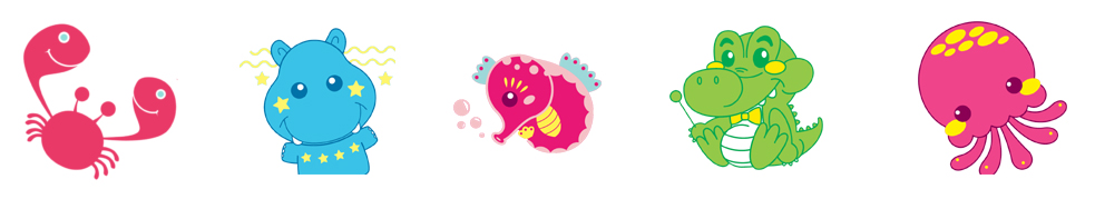 Ja jestem Meduzka Zuzka. A ja Krab Szkrab. A ten nieśmiały obok nas to Hipek Dowcipek. Koło niego siedzi Kroko Spoko. A tuż za nim płynie Morski Konik Pomponik. A ten co tak szybko zasuwa to Żółwiczek Ludwiczek. A nad wszystkim czuwa Misio Zdzisio.