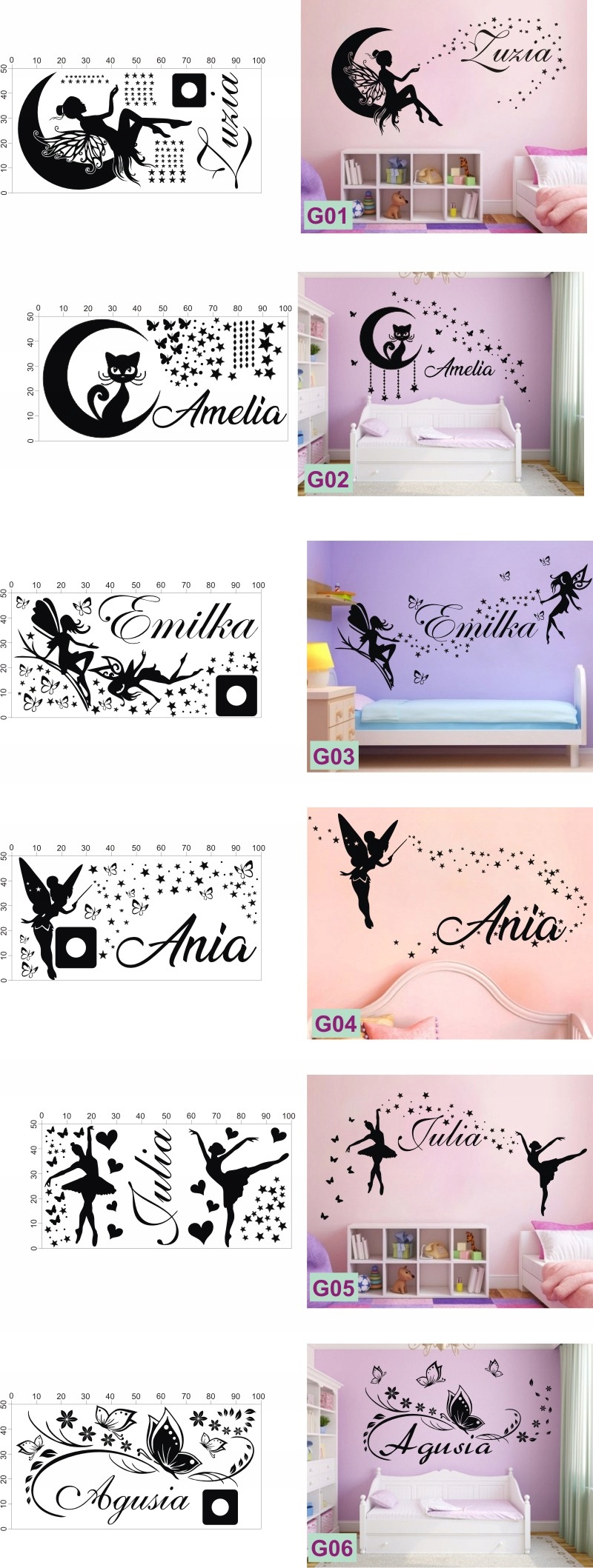 Naklejki na ścianę z dowolnym imieniem dziecka dla dziewczynek i chłopców na arkuszu o wymiarach 100cmx50cm