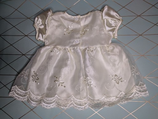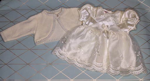 Гарний набір для хрещення/вишуканої вечірки. У тонах екрю/шампань. До нього входять: сукня з вишивкою, капелюшок, панталони, туфлі (з такого ж матеріалу з однаковими прикрасами) та светр. Розмір на етикетці: 0-3 місяці, приблизно 56-62 см. Користувалася один раз, стан дуже хороший.