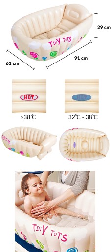 Окремо накачуваний валик в центральній частині дна не дасть малюкові випадково сповзти під воду. Все зроблено з перевіреного вінілу. Дуже важливою перевагою цієї ванночки, що виділяє її серед інших, є спеціальний індикатор температури води, що забезпечує безпеку дитини, яка після перевищення 38 градусів Цельсія змінює колір на червоний. Мала вага і розміри дозволяють брати ванну з собою в кожну поїздку. Ідеальне рішення для тих, хто подорожує з маленькими дітьми.