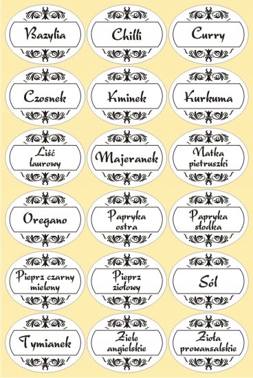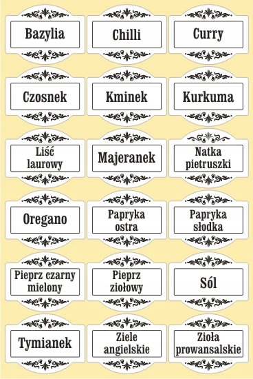 Przygotuj własną listę z nazwami (proszę unikać długich nazw typu "Grecka mieszanka przypraw do sałatek" - coś takiego fizycznie się nie zmieści na tak małej naklejce), a następnie dokonaj zakupu odpowiedniej ilości naklejek.