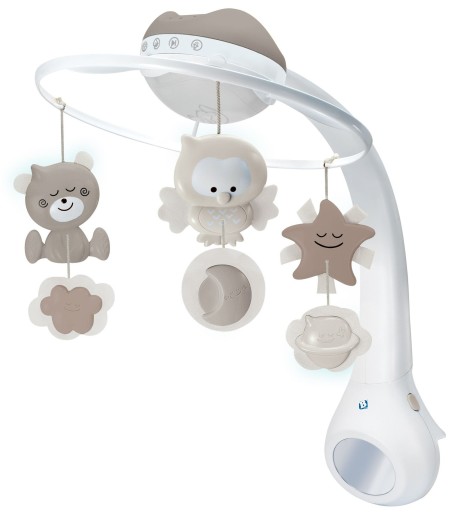 Мелодії, підібрані сномологами, допоможуть вашій дитині спокійно заснути. На вибір є 6 різних мелодій і 4 звуки природи. Щоб захистити чутливі вуха малюка, іграшка має шестирівневий регулятор гучності з можливістю вимкнути звук. Мелодії супроводжуються світлом лампи та проектора. Заспокійливе світлодіодне світло та різнокольорове зоряне небо на стелі подарують вашому малюку відчуття безпеки. Карусель оснащена таймером, який поступово вимикає музику і світло через 20 хвилин, дозволяючи дитині спокійно заснути.