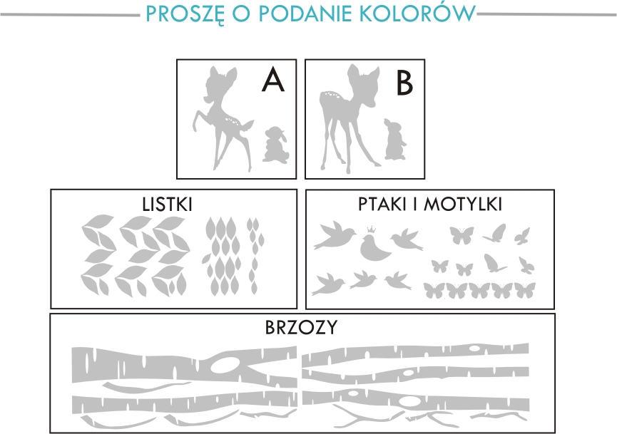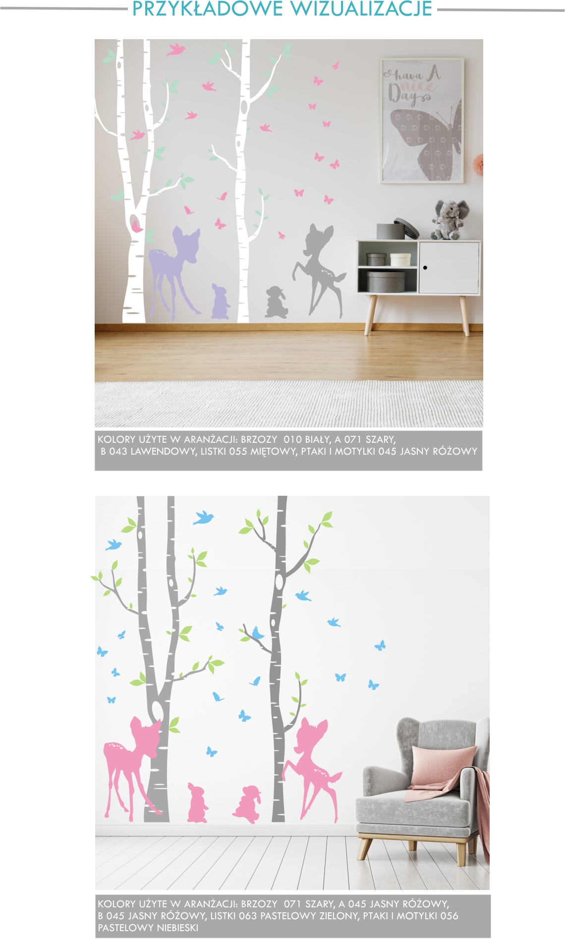 np: BRZOZY (kolor 010), LISTKI (kolor 072), JELONEK A (kolor 073), JELONEK B (kolor 010), PTAKI I MOTYLKI (kolor 045)