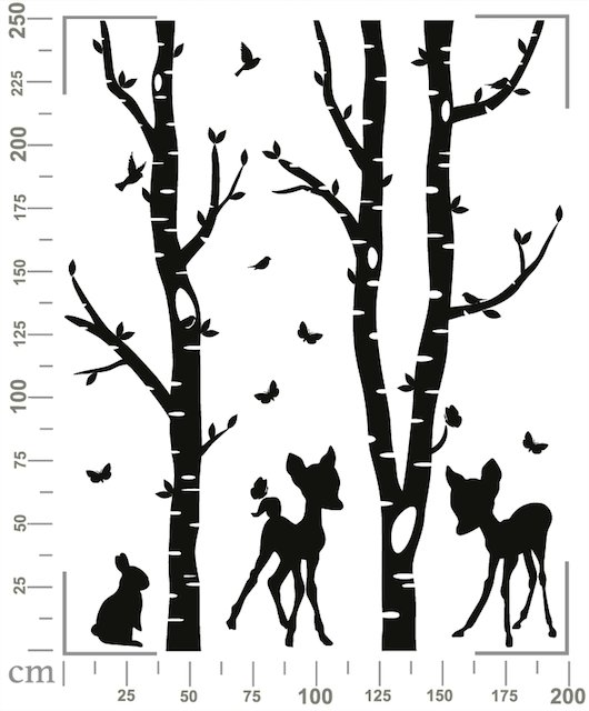 Drzewa (71x250cm; 114x250cm), Jelonki (46x80cm; 43x75cm), Królik (23x37cm), Listki Motyle Ptaszki (8-15cm)