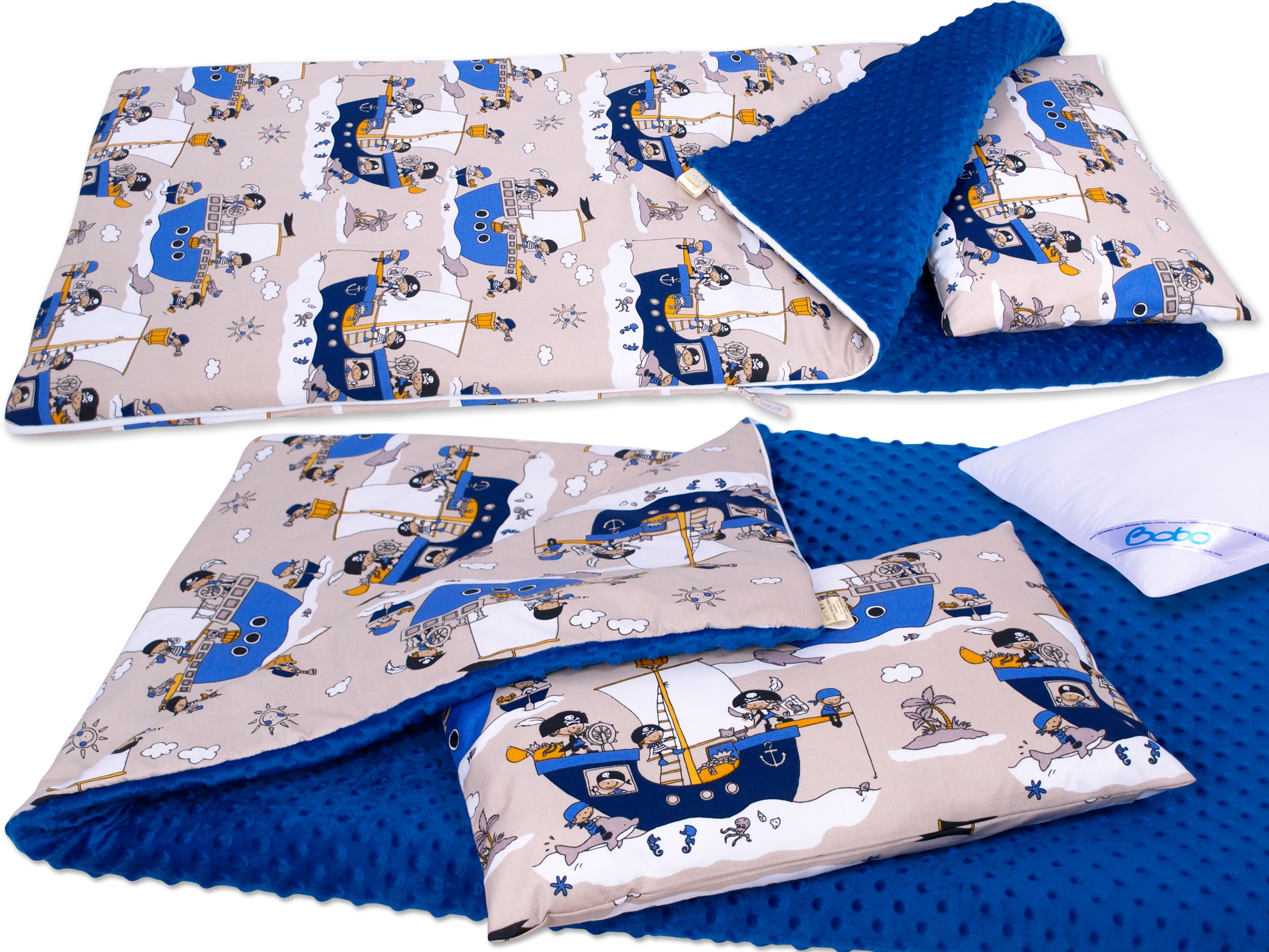 Wymiary: Dł. śpiworka bez poduszki 120 cm, szer. 60 cm. Po rozłożeniu 120 x 120 cm. Poduszka i poszewka 50 x 30 cm.