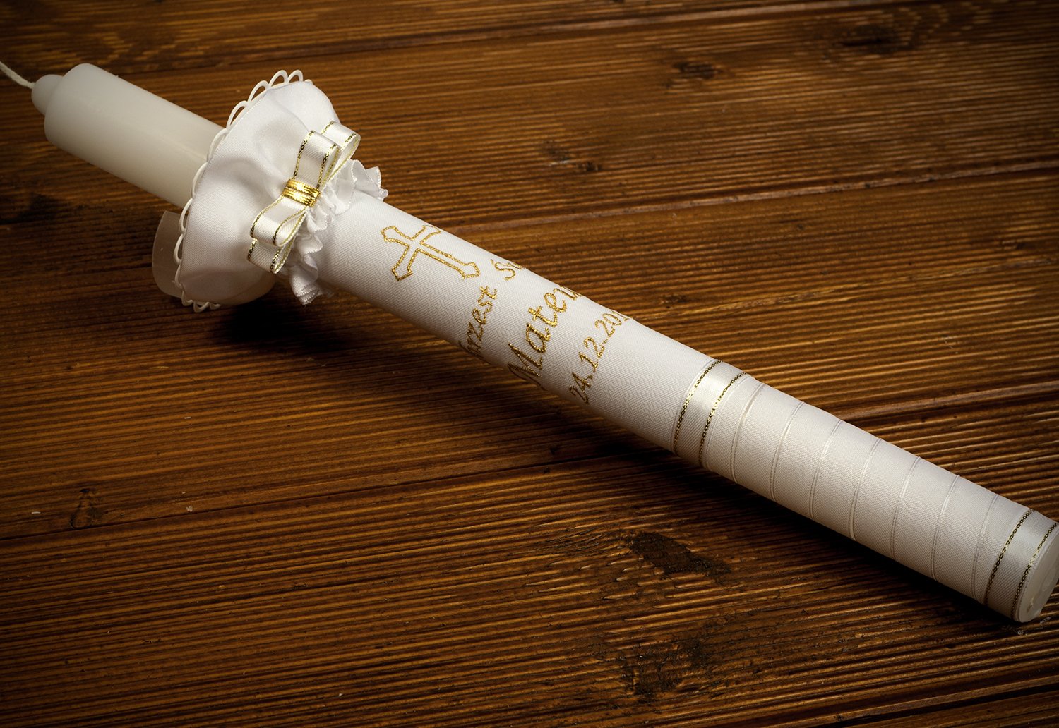 - Świeca z haftem w kolorze złotym, okapnikiem udekorowanym marszczoną muślinową wstążką.