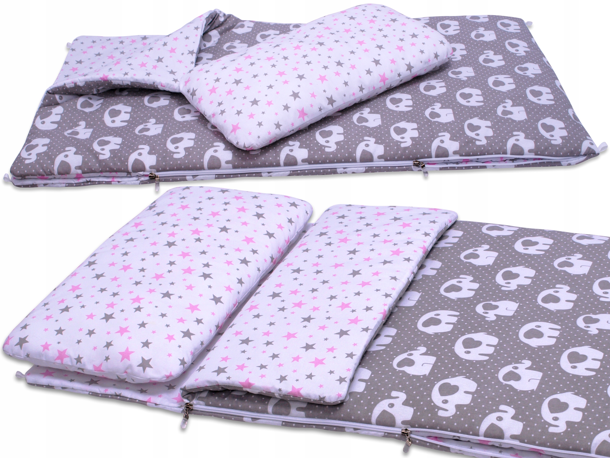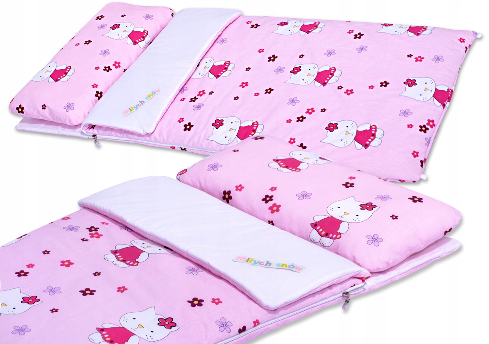 Wymiary: Dł. śpiworka bez poduszki 155 cm, szer, 70 cm. Poduszka 28 x 60 cm.