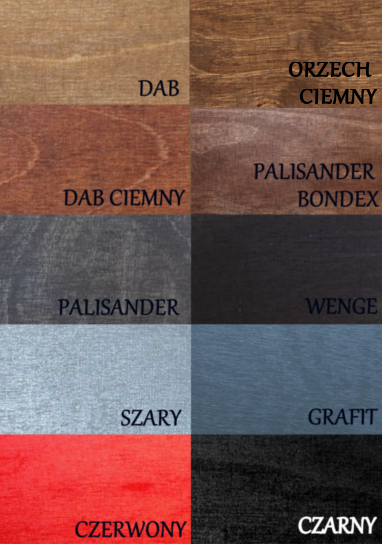 dąb, dąb ciemny, orzech ciemny, palisander, palisander bondex, wenge, biel, szary, grafit, czarny, czerwony.