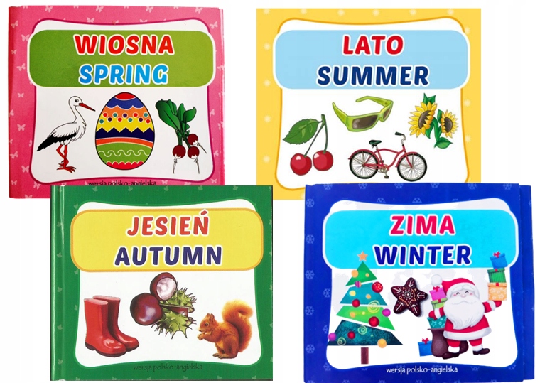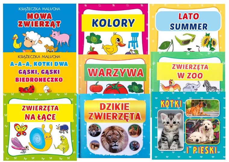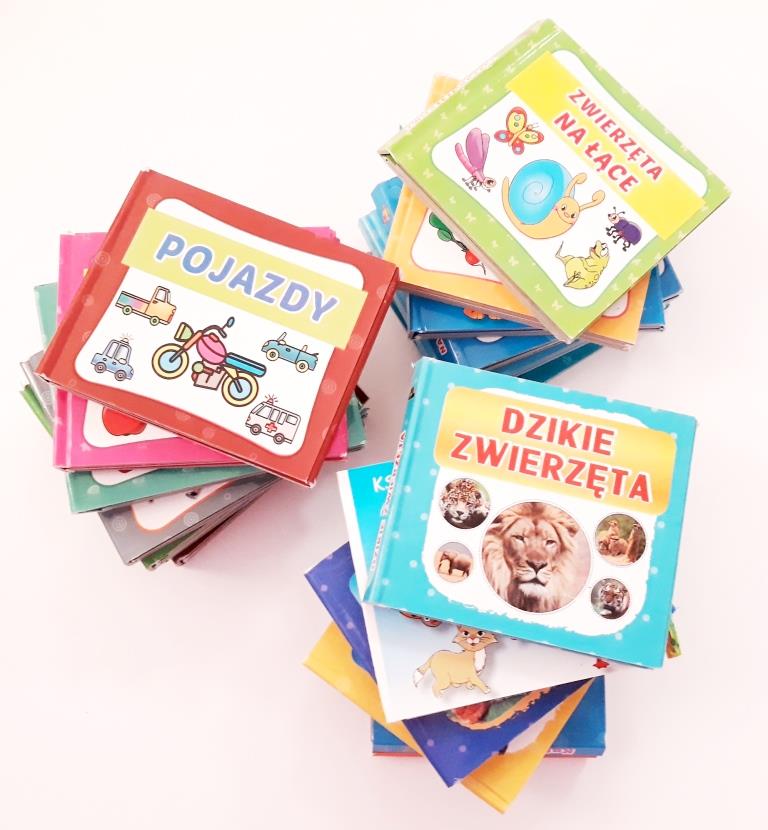 każda książeczka to proste, kolorowe obrazki wraz z podpisem