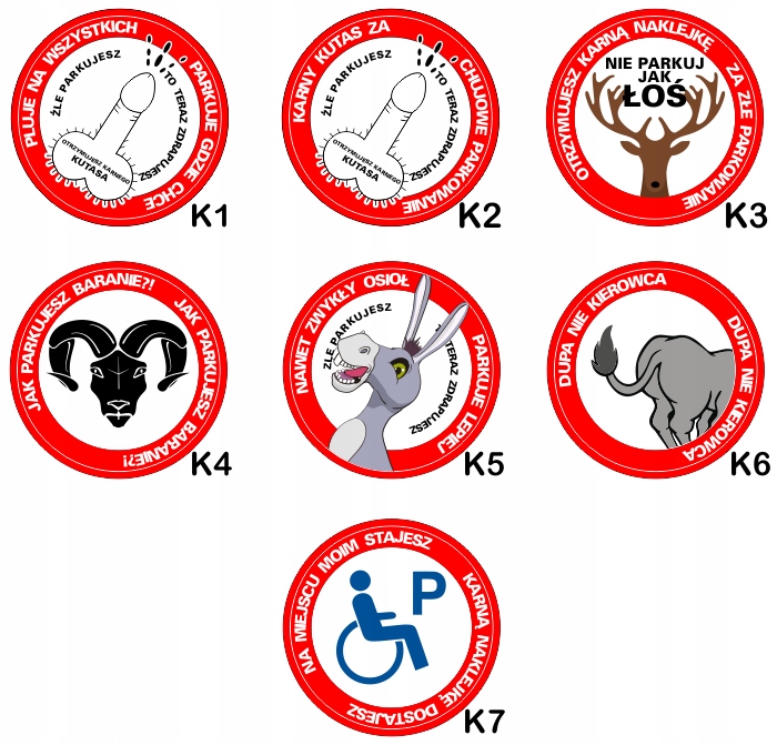 Oferujemy naklejki z karniakami o wielkości 15cm, idealne do ukarania chamskiego parkowania. Dzięki mocnemu klejowi niełatwo jest go odkleić od samochodu, przez co nauczka będzie jeszcze bardziej bolesna.