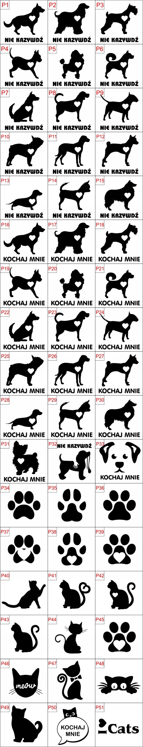 W formularzu przy zamówieniu prosimy o wybór wzoru naklejki oraz jej koloru (czarny lub biały). Dodatkowo, istnieje możliwość wycięcia czworonoga w lustrzanym odbiciu.