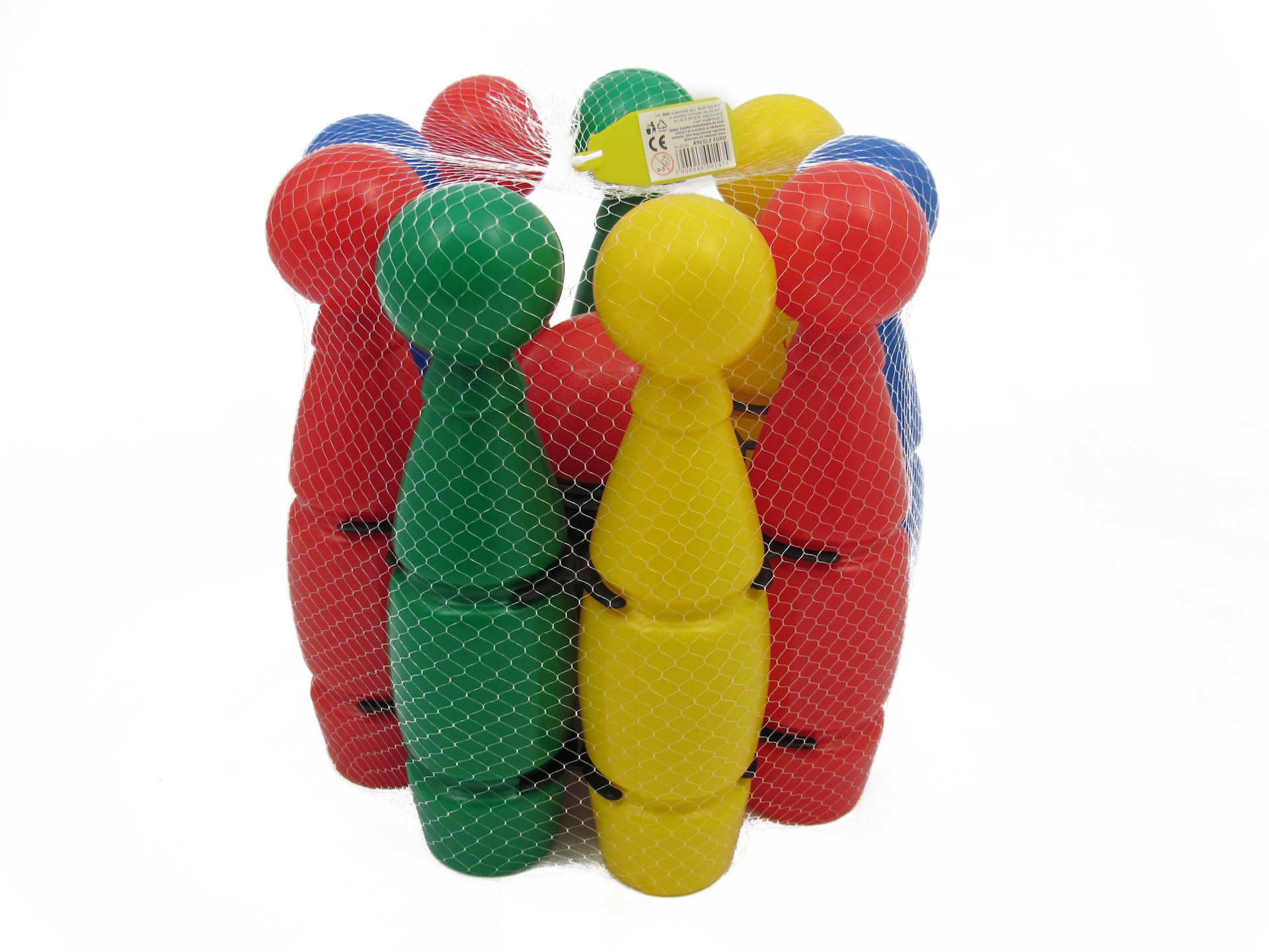 W zestawie znajduje się 9 kręgli, 2 kule oraz stojak do zapakowania całego zestawu.
