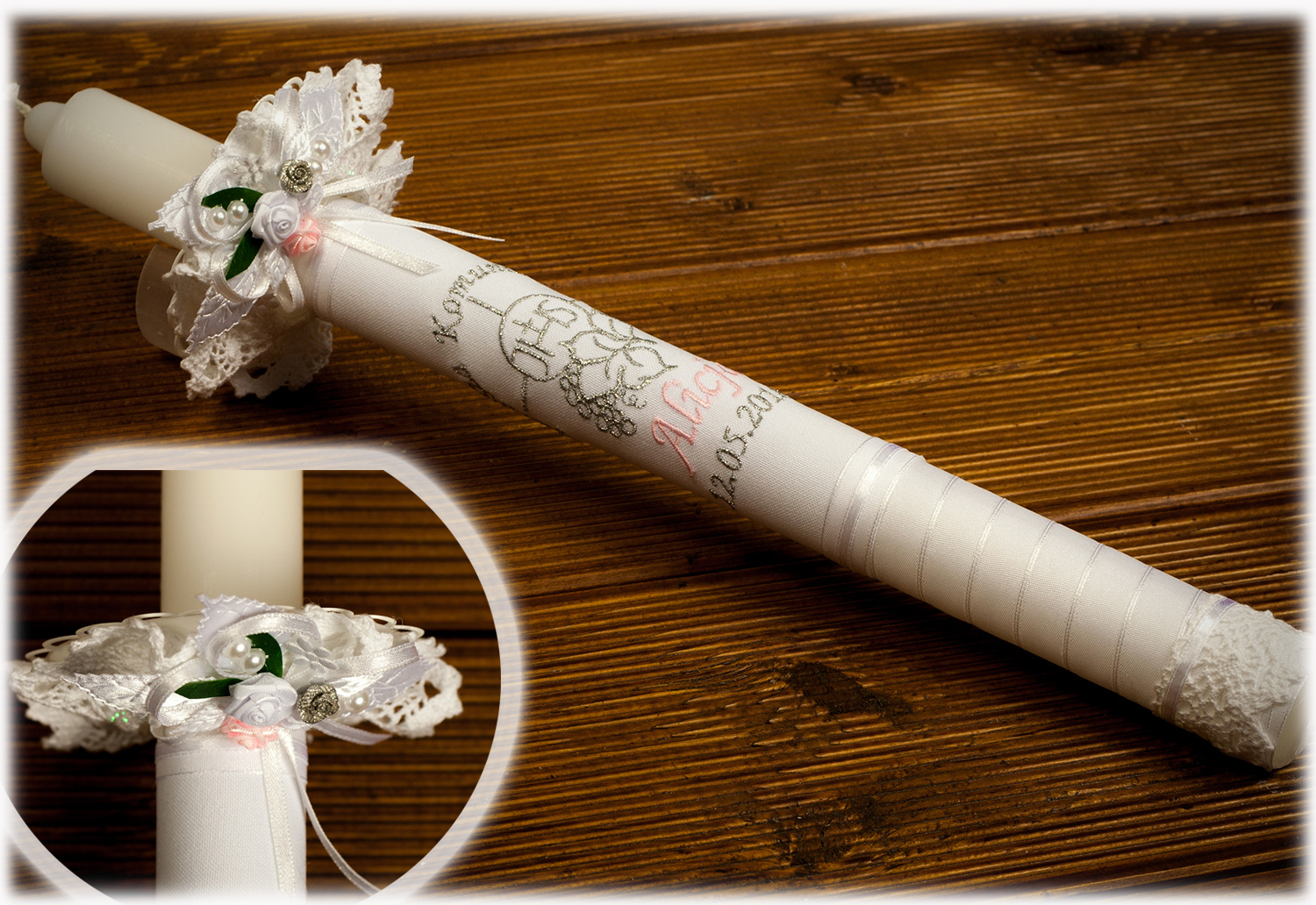 - Świeca z haftem w kolorze różowym, dekoracją i okapnikiem,
