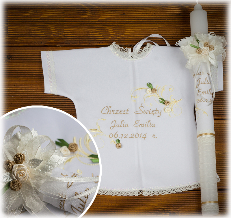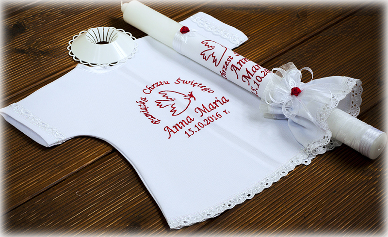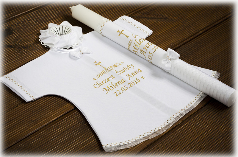 W skład zestawu wchodzi: biała szatka w kształcie koszulki i świeca, z wyhaftowanymi imionami i datą Chrztu Dziecka.