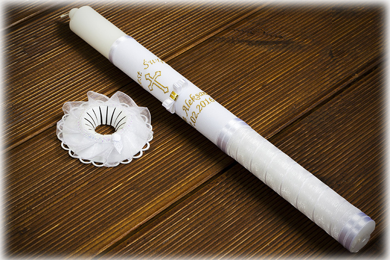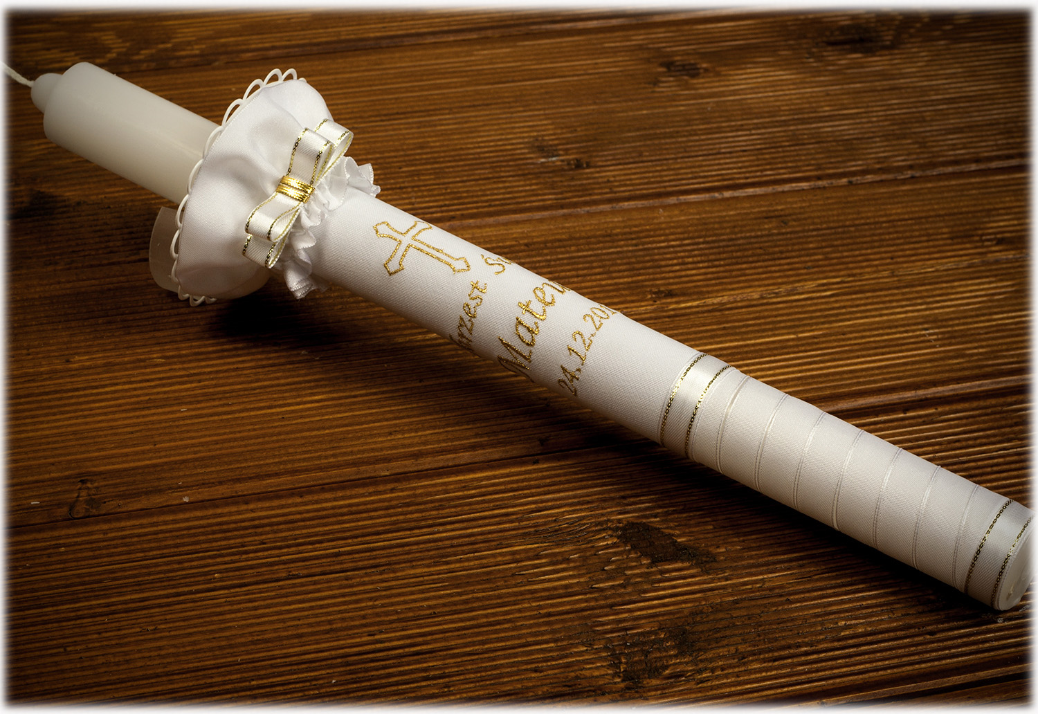 - Świeca z haftem w kolorze złotym, okapnikiem udekorowanym marszczoną muślinową wstążką.