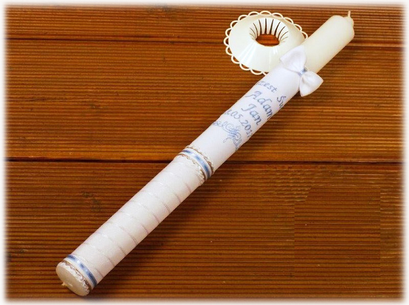 - Świeca z haftem w kolorze niebieskim, dekoracja srebrno niebieska, okapnik,