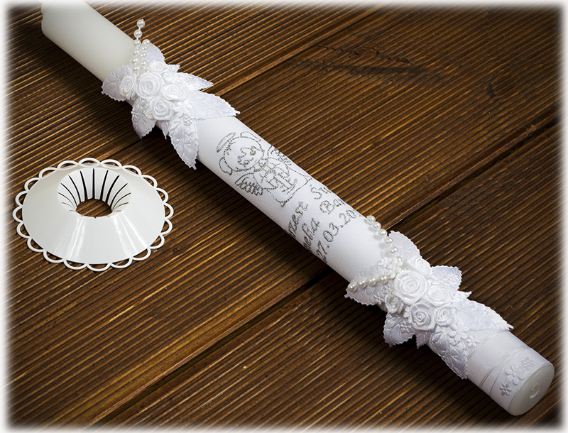 - Świeca z haftem w kolorze srebrnym, dekoracja biało srebrna, okapnik.