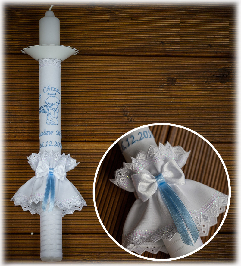 - Świeca z haftem w kolorze srebrno-niebieskim, okapnik.