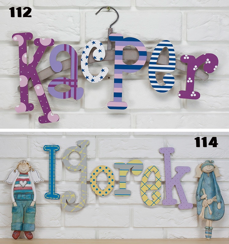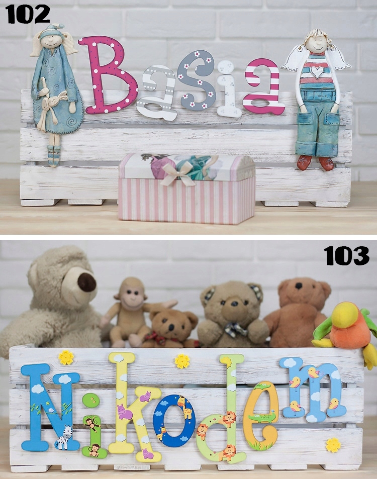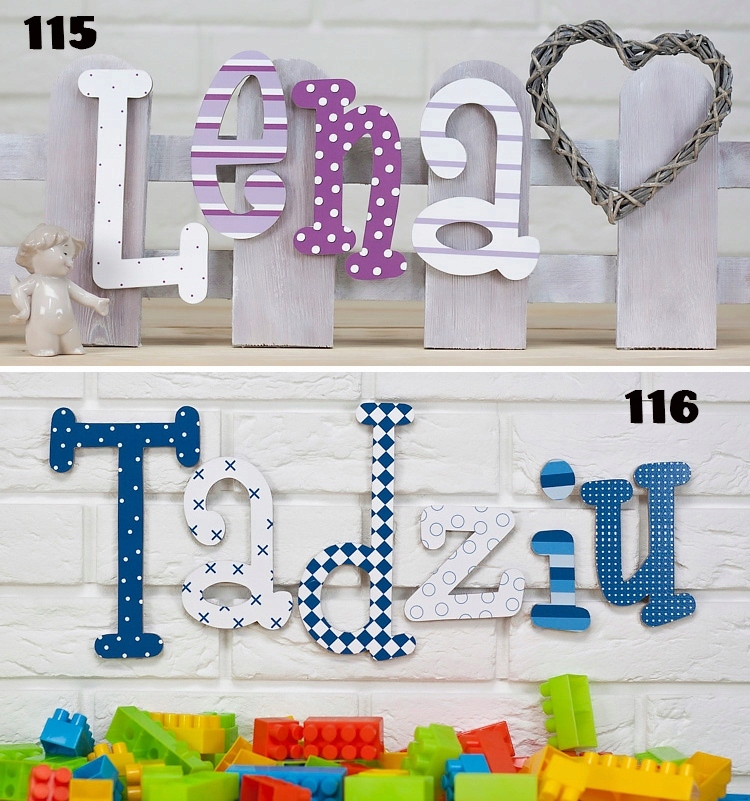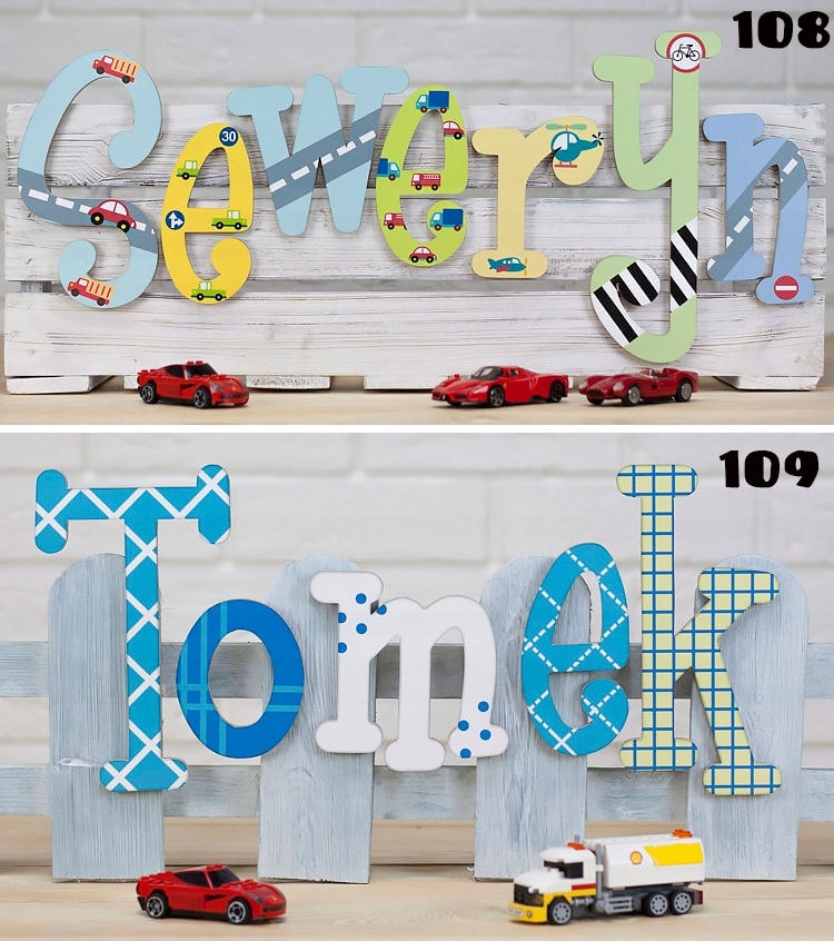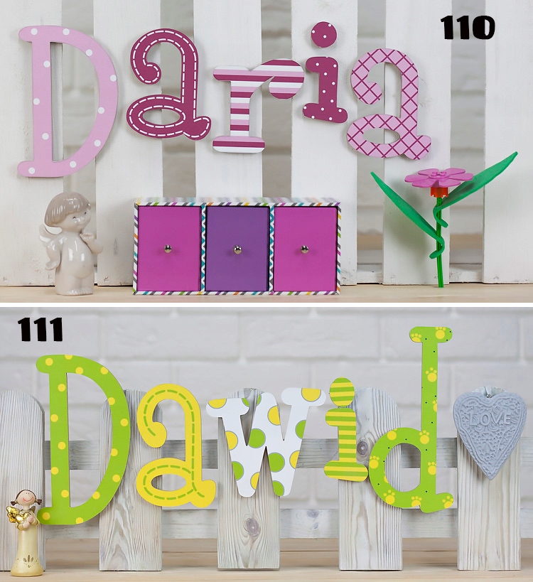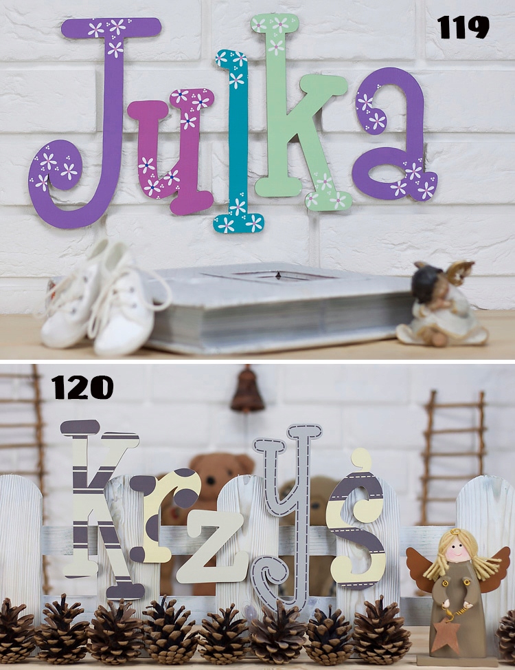 Literki wykonane ręcznie na podłożu z twardej płyty mdf stanowią piękne i oryginalne wykończenie każdego dziecięcego wnętrza. Motywy na literkach są pokryte lakierem akrylowym z połyskiem przeznaczonym do malowania zabawek i mebli dla dzieci. Każdy zestaw literek jest wykonywany na indywidualne zamówienie.