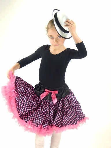 Верх — блискучий — складається з чорної кокетки плюс двох рясно гофрованих кружечків, зшитих разом — із веселими крапочками. Кінець оброблений подвійним прямим воланом. Широка гумка на талії + подвійний бант контрастного кольору. Нижній шар - це сильно зібраний фатин, знову оброблений подвійним воланом - піднімає спідницю вгору. Це не звичайна спідниця ТУТУ - вона стирчить завдяки воланам - не жорсткий фатин - вона також ідеальна для повсякденного використання.