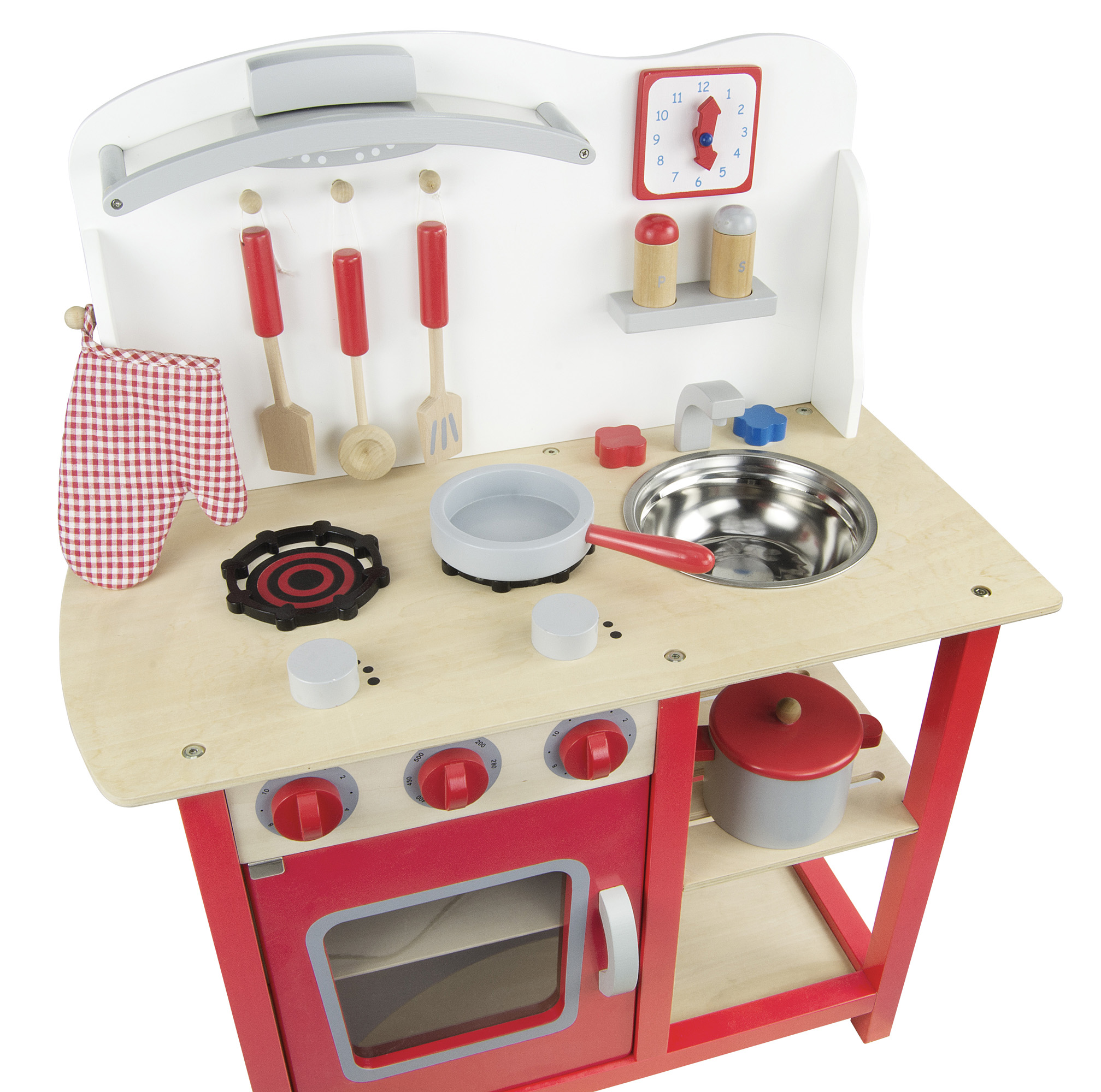 Najwyższej jakości prestiżowa, drewniana kuchnia do zabawy w gotowanie. Precyzyjnie wykończona i bogato wyposażona. W zestawie z zegarem, który może być pomocny przy nauce jego odczytywania oraz akcesoriami które zapewnią długie godziny niezapomnianej zabawy.