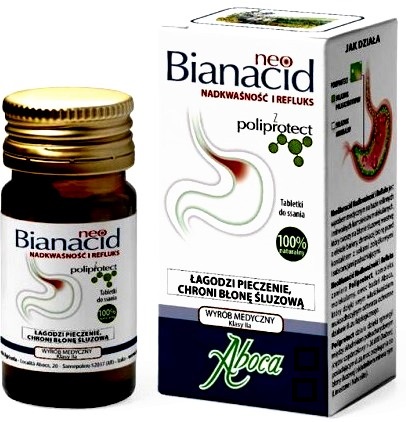 NeoBianacid Nadkwaśność i Refluks wspomaga rozwiązywanie problemów związanych z nadkwaśnością żołądka, takich jak pieczenie, ból, refluks żołądkowo‑przełykowy i zapalenie żołądka. Może wspomagać leczenie objawów związanych z dyspepsją (trudności w trawieniu), takich jak pieczenie, uczucie ciężkości i bębnica.