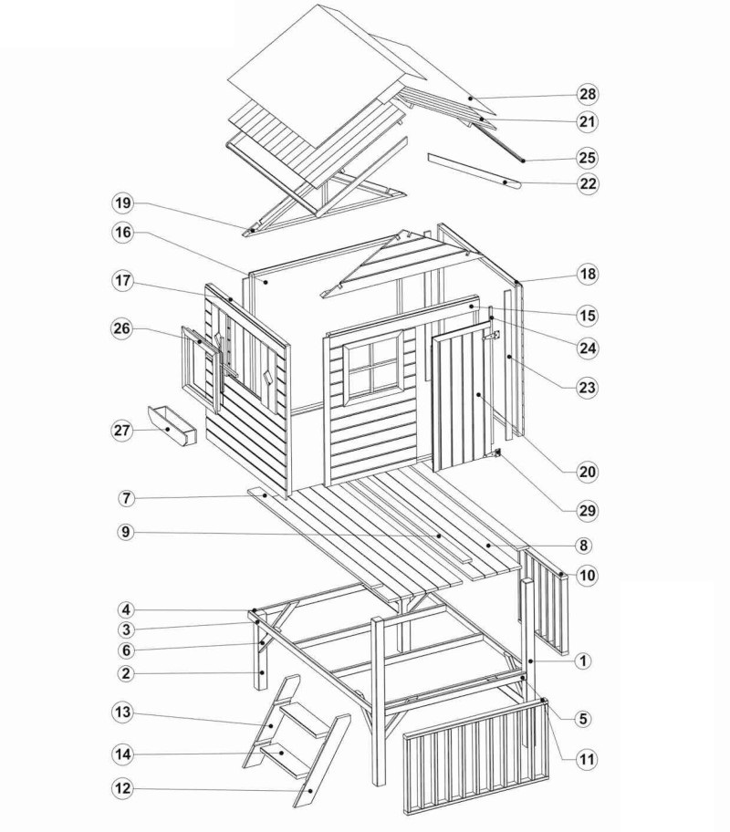 Domek posiada 1 drzwi, 2 stałe okna wypełnione bezpieczną przeźroczystą płytą plexi, czarna papa na dach, zestaw śrub montażowych i elementów łączących zgodnie z instrukcją.