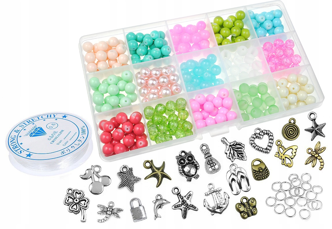 Zestaw do nawlekania SUPERMODNYCH kolorowych bransoletek na gumce z koralików szklanych.