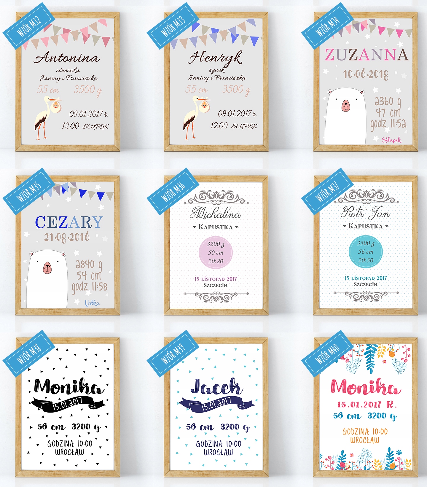 Uwaga! Po zakupie prosimy o wskazanie wybranego wzoru oraz podanie imienia, daty, godziny, miejsca urodzenia, wagi i wzrostu dziecka. Prosimy również pamiętać o podaniu rodzaju papieru.