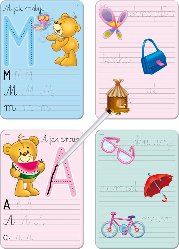 Ćwiczenie to ułatwia suchościeralny marker, którym można pisać nawet krzywo i nie w linijce, gdyż szmatka to wszystko szybko zmaże i znów można próbować napisać prostą i piękną literkę.