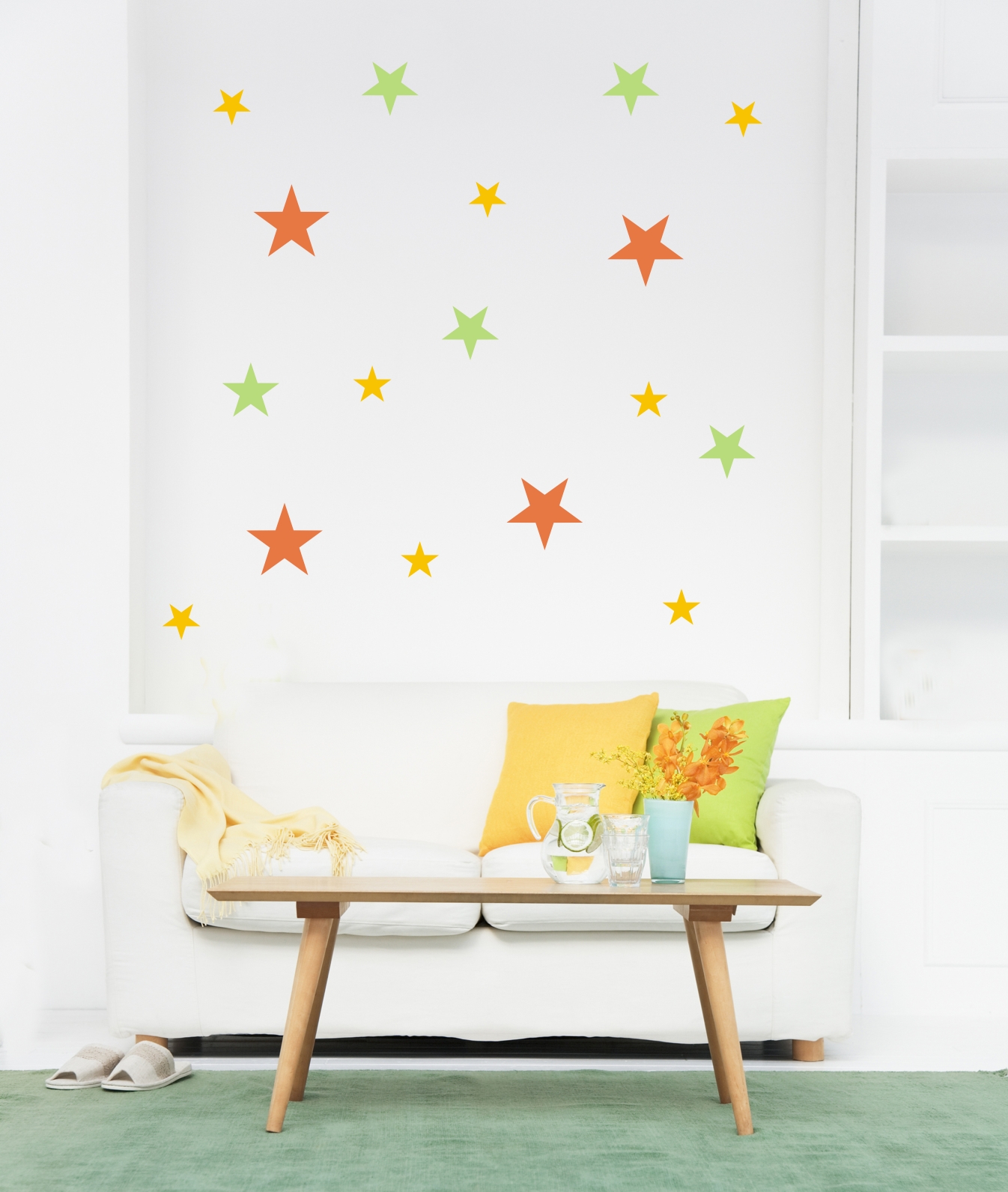Przedmiotem sprzedaży są 3 arkusze samoprzylepnych gwiazdek (łącznie 234 sztuki) w różnych rozmiarach i kolorach.