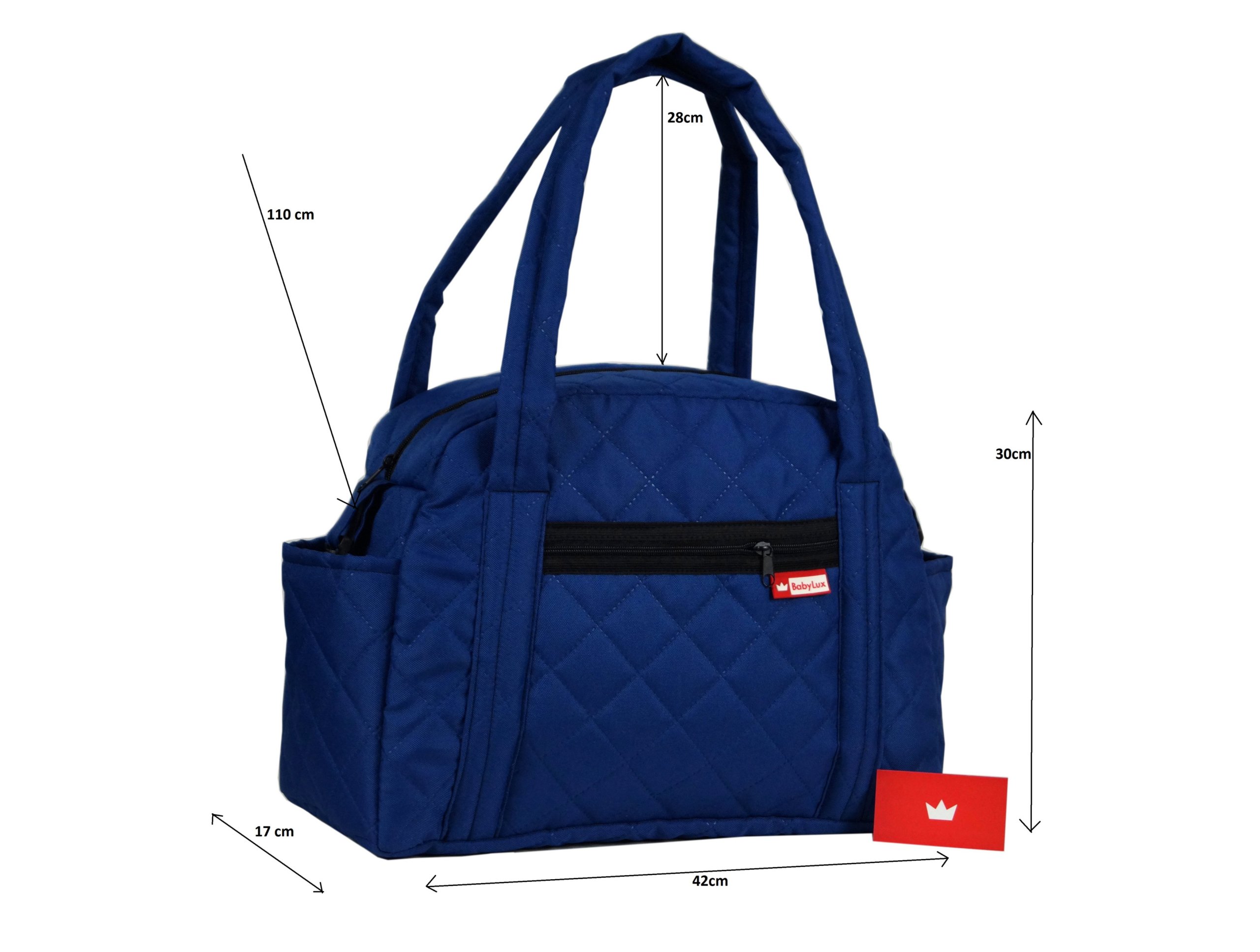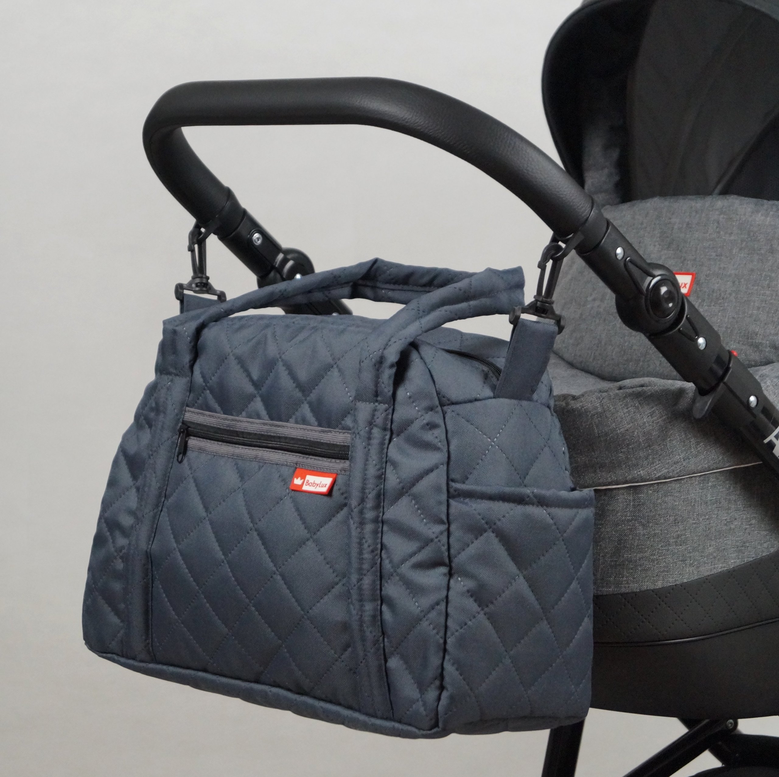 Nowoczesna, pojemna, praktyczna, solidnie wykonana torba, niezastąpiona podczas codziennych spacerów i w podróży. Wykonana z atestowanych, impregnowanych (wodoodpornych) tkanin poliestrowych pikowanych stosowanych do produkcji wózków dziecięcych . Wewnątrz znajduje się czarna nieprzemakalna podszewka. Torbę stanowi duża komora główna zapinana na zamek oraz 5 kieszeni. Jedna kieszeń wewnątrz torby, na zewnątrz : dwie boczne kieszenie na butelki , kieszeń z tyłu oraz z przodu kieszeń zapinana na zamek na drobne akcesoria i dokumenty. Torba wyposażona jest w długi pasek do noszenia na ramieniu oraz uszy do noszenia na ramieniu lub w ręku.Torba posiada klipsy do montażu na wózku wyposażonym w haczyki oraz komplet dodatkowych uchwytów zapinanych na rzep do montażu na każdym innym wózku który nie jest wyposażony w haczyki do zawieszenia torby.