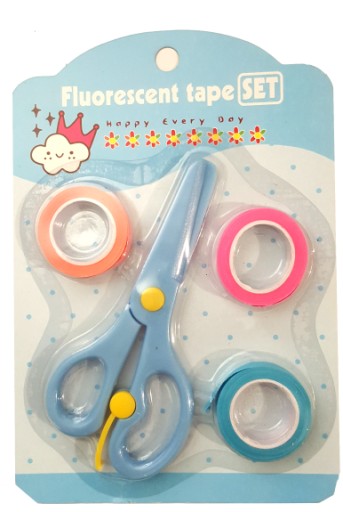 У набір входять пластикові «безпечні» ножиці для паперу, ідеальні як перші ножиці для малюка. Додатково в комплект входять 3 кольорові (флуоресцентні) паперові стрічки.