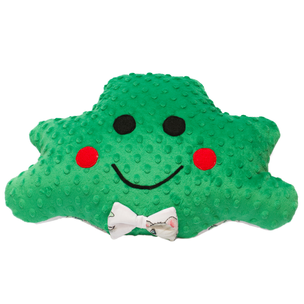Przód podusi to wysokogatunkowe minky 380 g/m2,posiada Certyfikat " Bezpieczny dla dziecka" . Oczy, buzia uszyte są z filcu. Kokardka w kolorze bawełny, (na życzenie kokardka lub muszka).