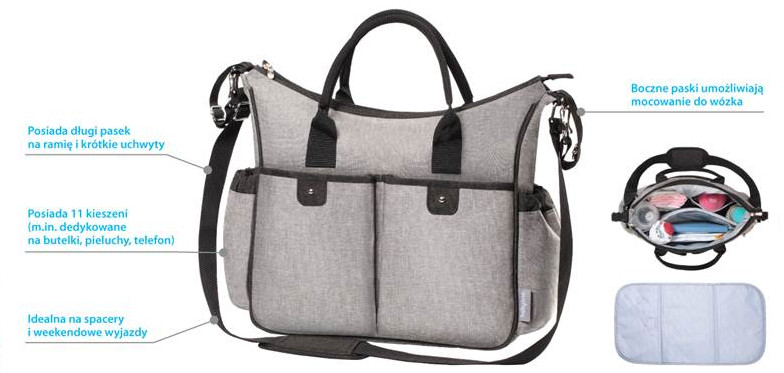 Torba dla mamy „SO CITY!" to modna miejska torba na rzeczy mamy i dziecka. Przemyślana funkcjonalność sprawia, że torba jest idealna na spacery, a nawet weekendowy wypad. Posiada długi pasek na ramie oraz krótkie uchwyty, a także matę do przewijania. Torba zawiera 11 kieszeni w tym m.in. dedykowane na butelki, pieluchy, telefon i dokumenty, główna komora zapinana jest na zamek. „SO CITY!" wyposażona jest w boczne paski, które umożliwiają mocowanie do dowolnego modelu wózka.