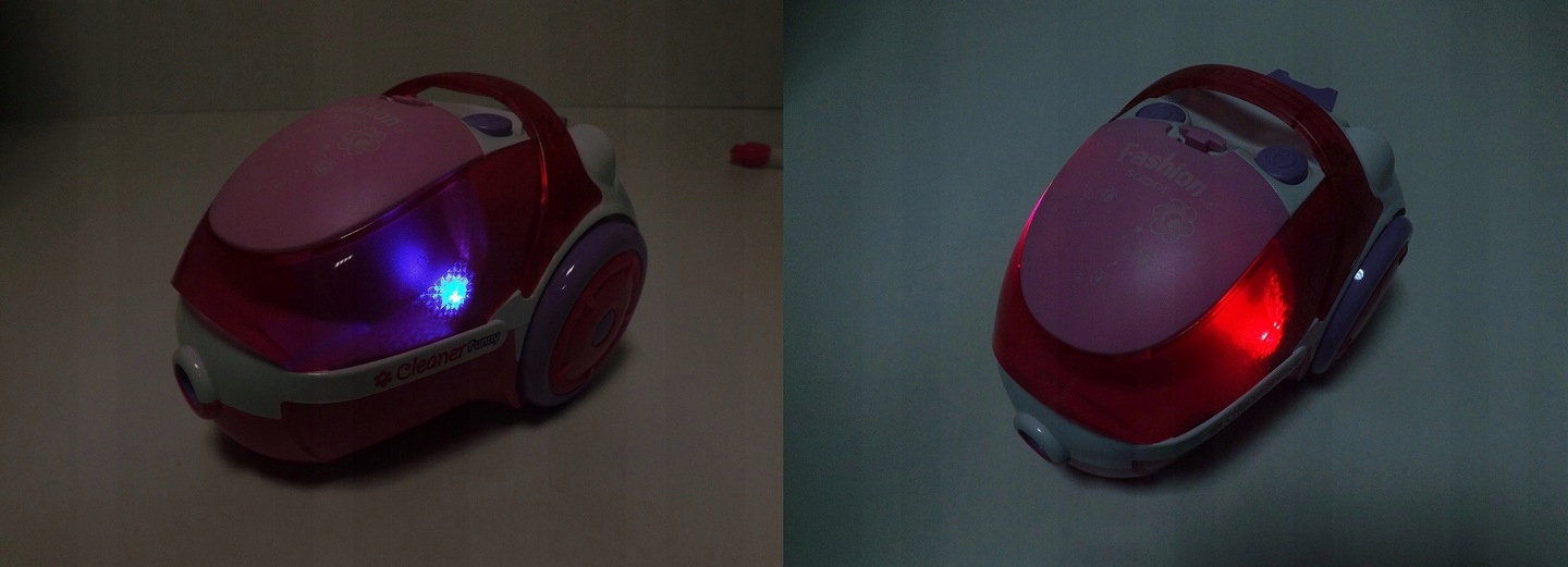 - ODKURZACZ WYDAJE DŹWIĘKI JAK PRAWDZIWY ODKURZACZ. ZASYSA STYROPIANOWE KULECZKI IMITUJĄCE ŚMIECI. GDY JEST ZAŁĄCZONY PO BOKACH MIGAJĄ ŚWIATEŁKA NA CZERWONO I NIEBIESKO.