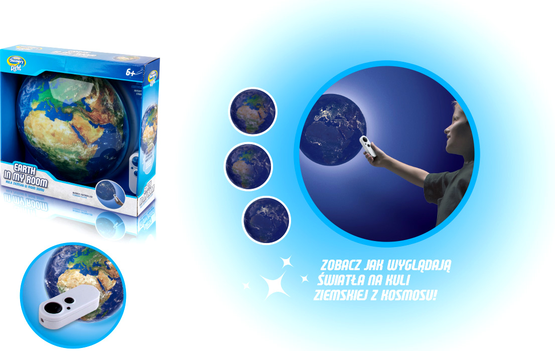 - zabawka automatycznie wyświetli rozmieszczenie oświetlenia na świecie - wyświetli natężenie oświetlenia na naszej planecie - można również samemu zmieniać rozmieszczenie oświetlenia na kuli ziemskiej