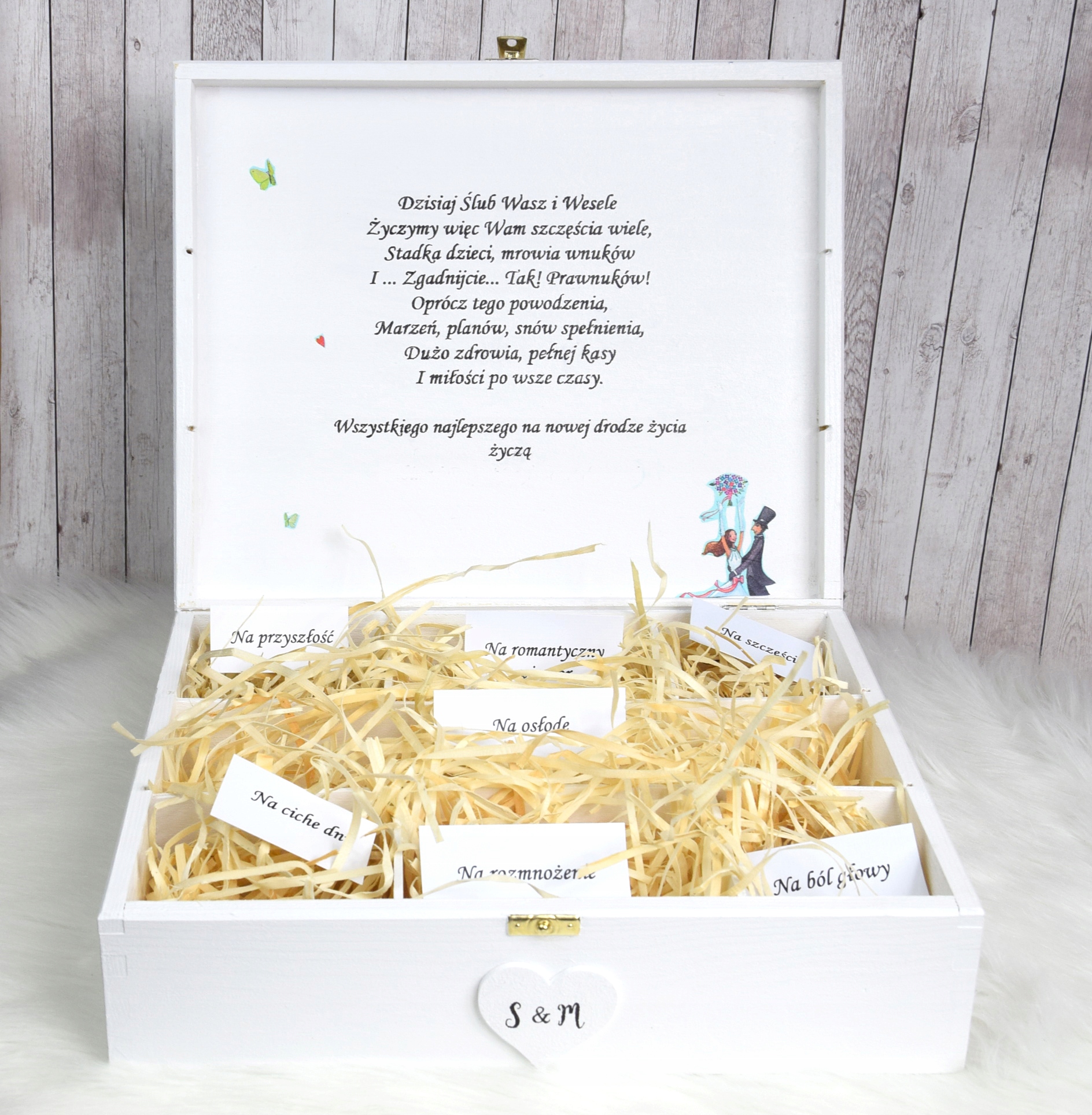 Na pudełku można nanieść datę ślubu oraz imiona nowożeńców. Na drewnianym serduszku zamieszam inicjały Państwa Młodych.