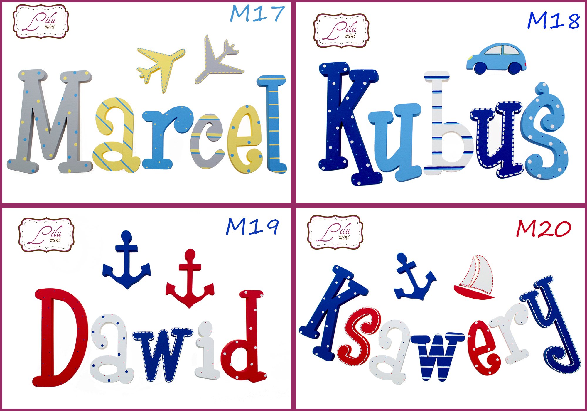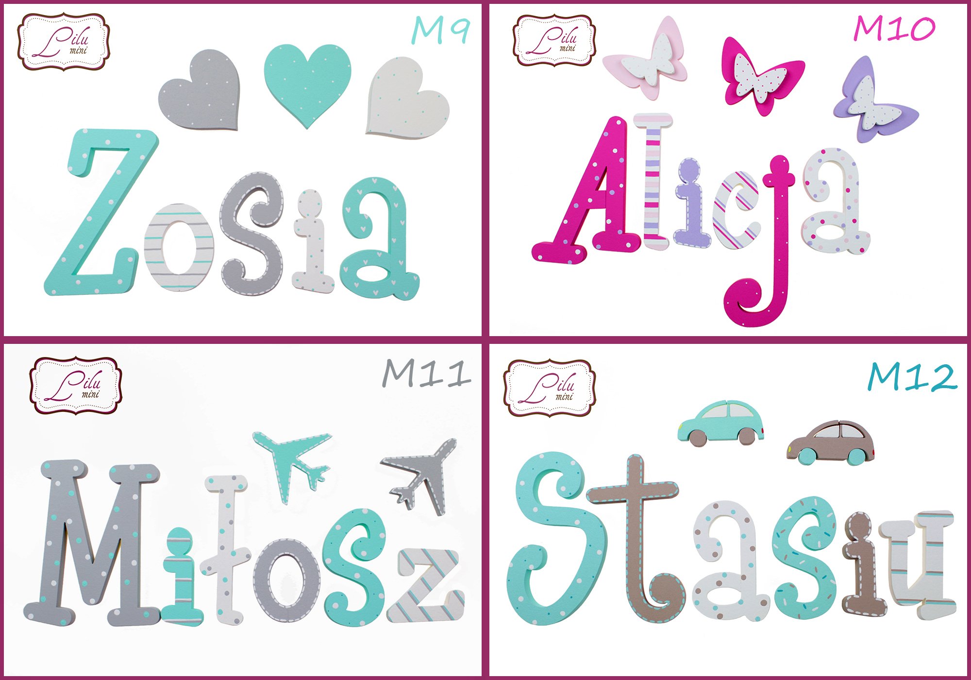 - W wiadomości dla sprzedającego podaj nam : imię które zamawiasz, nr wzoru który wybrałeś i rodzaj dekorów (np:Zamawiam imię Zosia, wzór nr M34 + 2xmotylek i 1 serce lub : Zamawiam imię Kubuś, wzór nr M26 + 3xsamolot)