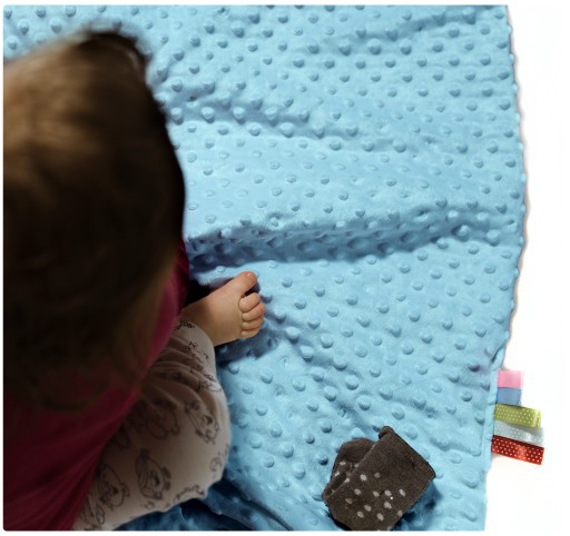 До ковдри пришиті різнокольорові стрічки - датчики, які стимулюють уяву, дотик та інші інстинкти впізнавання дитини.