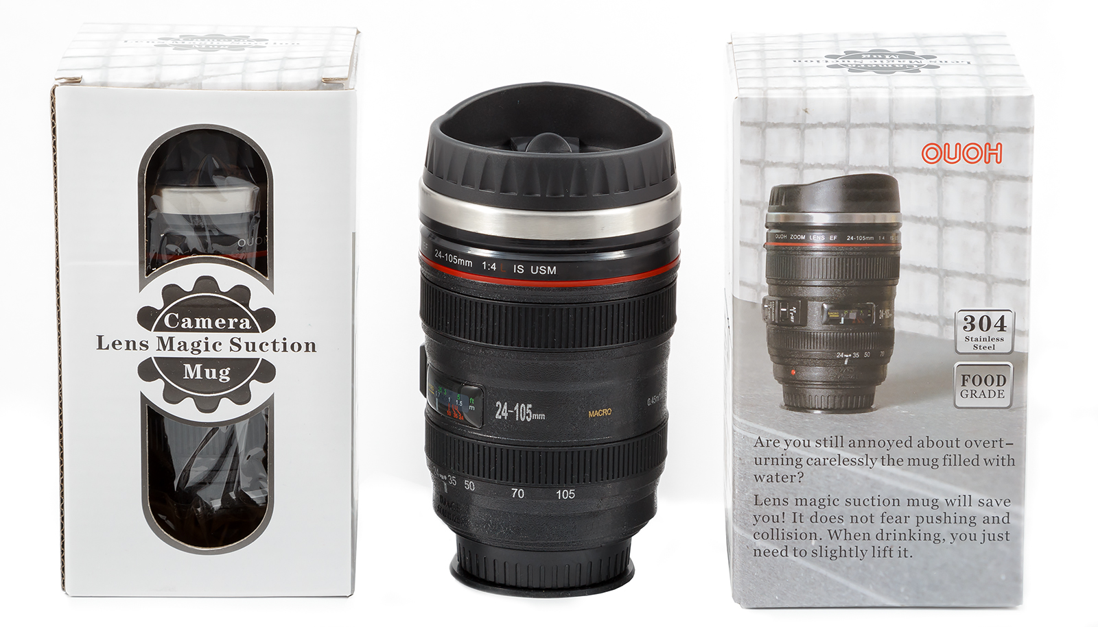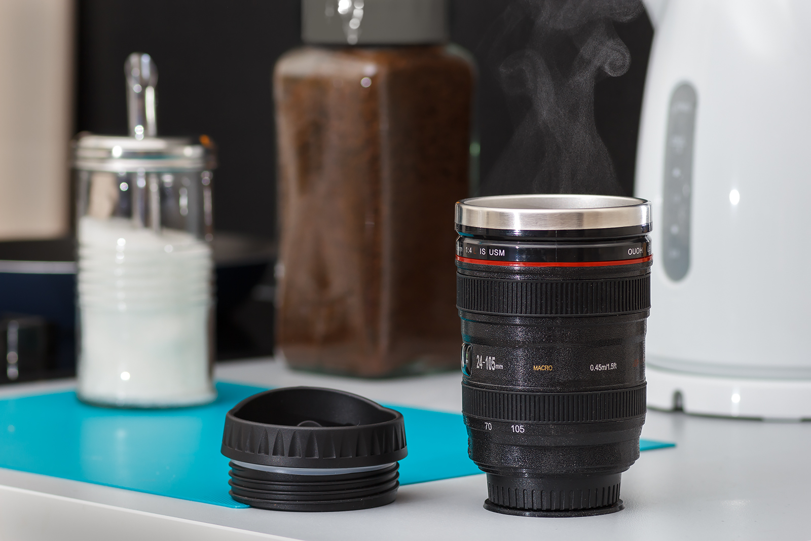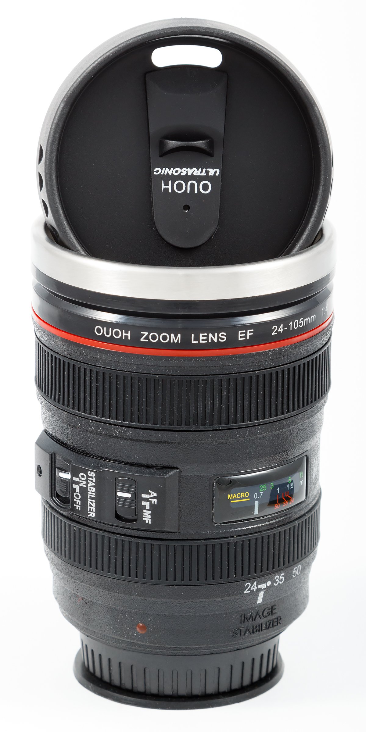 Kubek posiada gumowe paski, dokładnie tak jak obiektyw będący jego pierwowzorem.