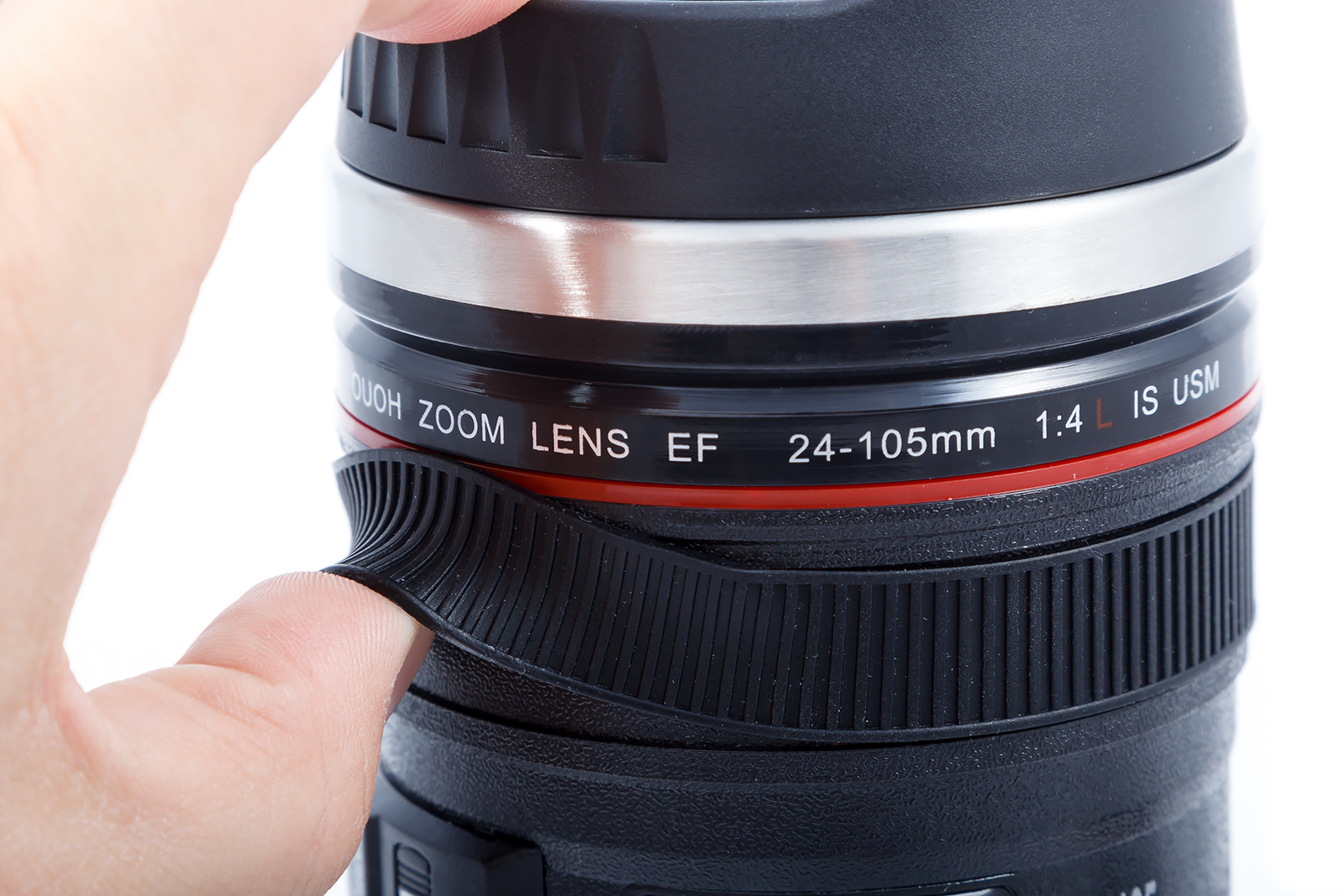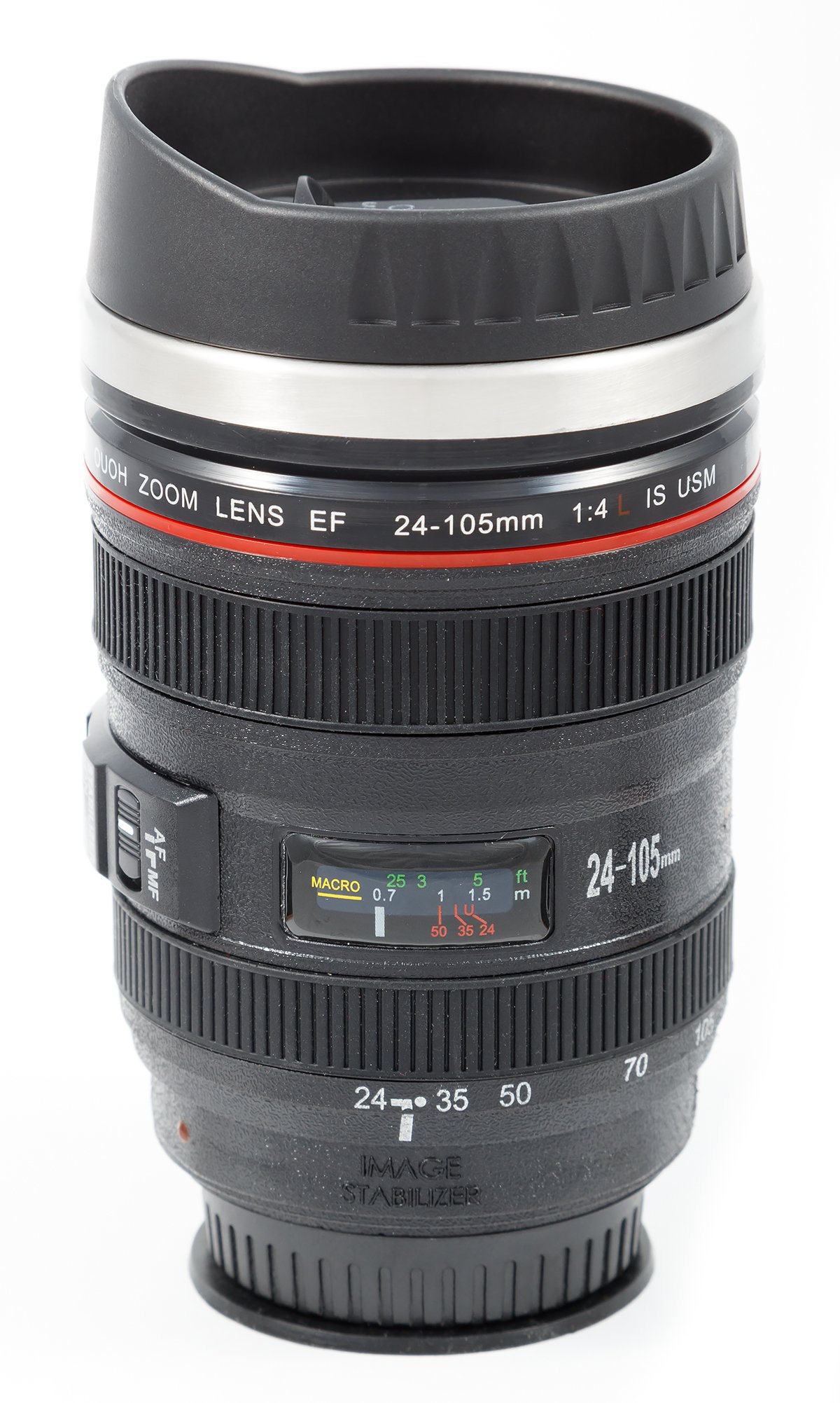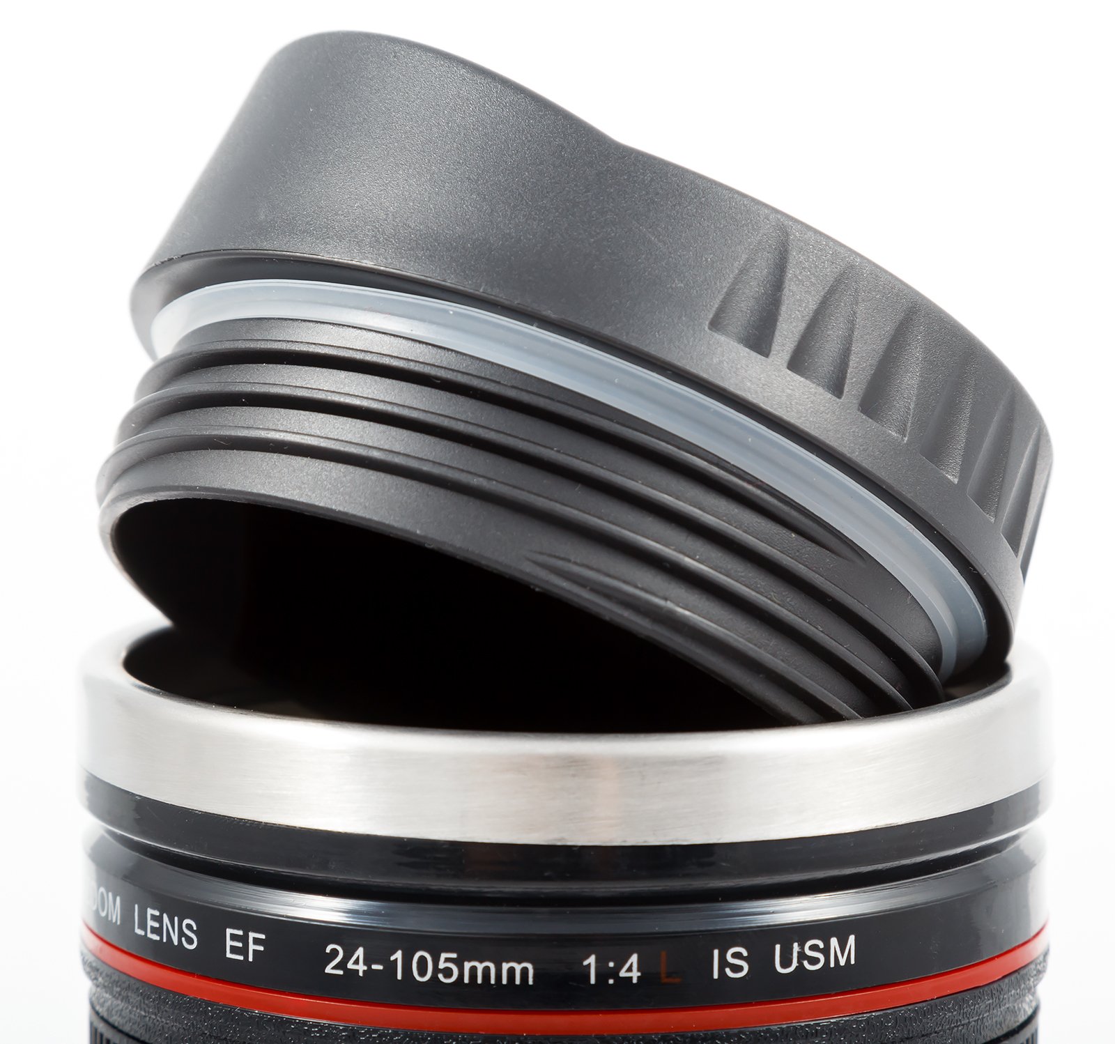 Kubek posiada gumowe paski, dokładnie tak jak obiektyw będący jego pierwowzorem.
