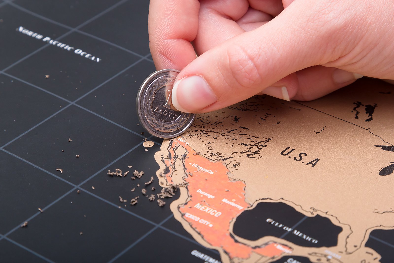 - możliwością zdrapywania mapy monetą,