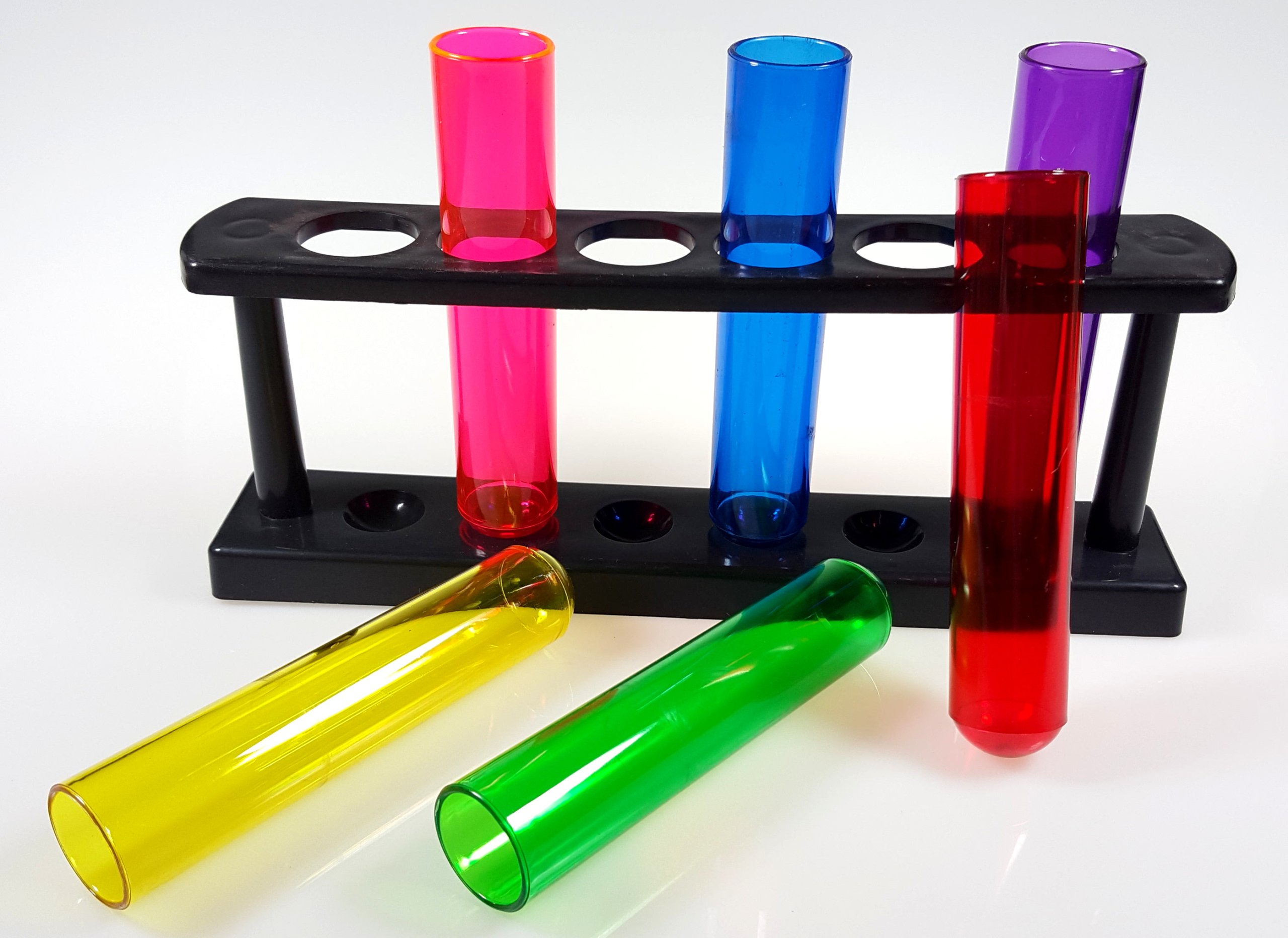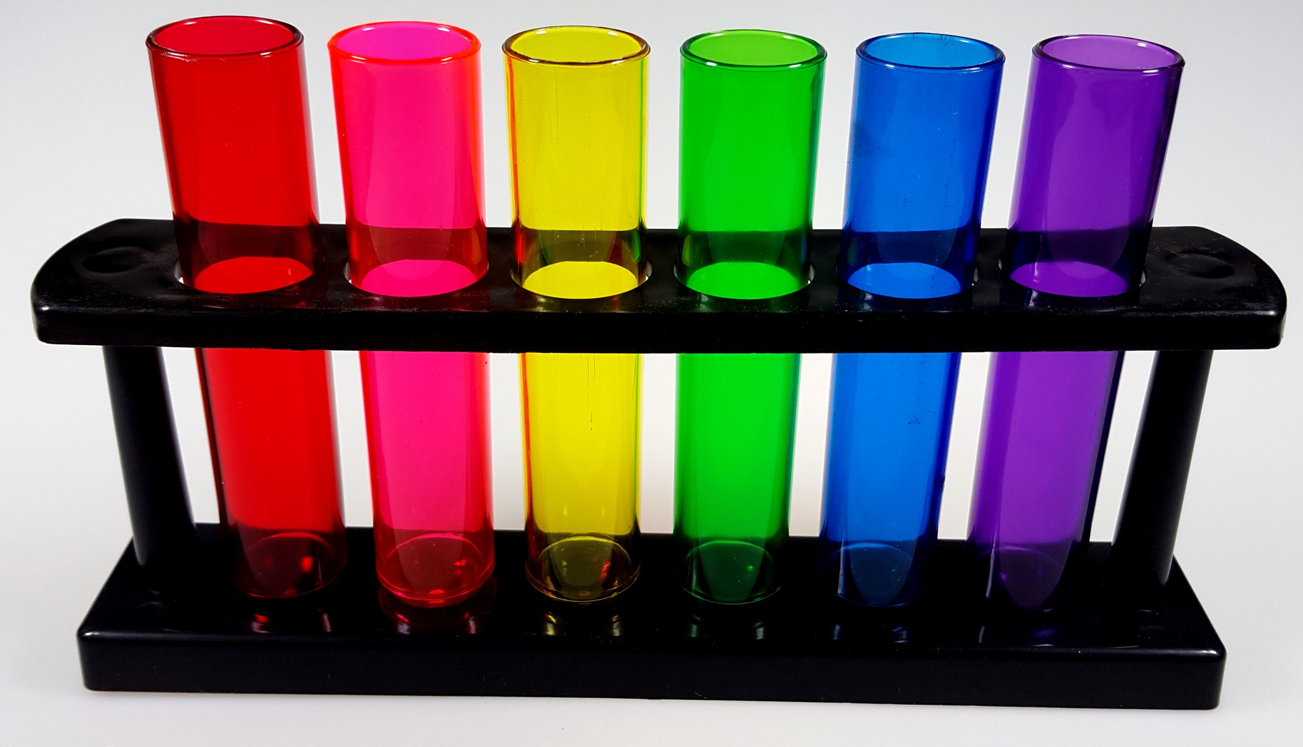 - plastikowy czarny stojak z sześcioma kolorowymi probówkami do shotów