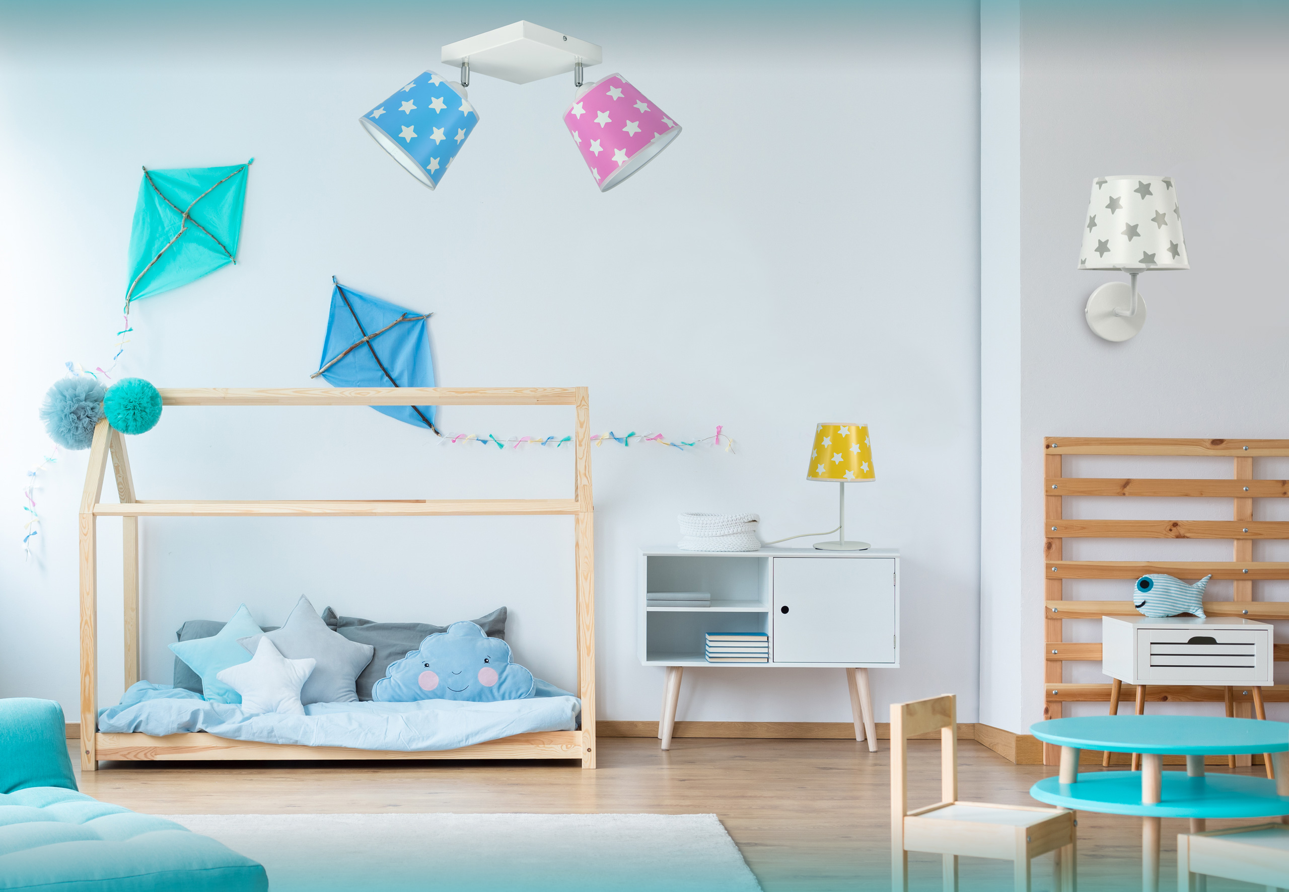 Kolorystyka kinkietu umożliwia montaż zarówno w pokoju chłopca jak i dziewczynki.