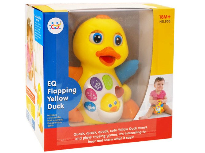 Ekscytująca akcja i zabawne dźwięki zachęcają dziecko do podążania za kaczuszką i do coraz śmielszego raczkowania.