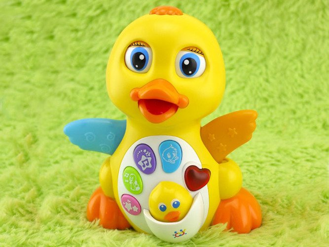 Naciskając kolorowe przyciski na brzuszku kaczuszki uruchomimy kolejno: