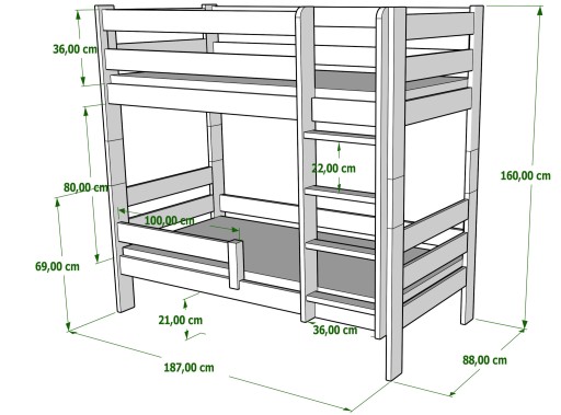 GAGATEK - це двоповерхове ліжко, повністю виготовлене з високоякісної сосни. Він ідеально підходить для кімнати братів і сестер, коли вам потрібно оптимально використовувати простір, який поділяють ваші діти. Захисні дерев'яні поручні запобігають падінню, а діти можуть безпечно та зручно підійматися по драбині з плоскими щаблями. Також можливе використання версії GAGATKA з двома незалежними петлями. колесо, яке можна складати та розбирати багато разів, без шкоди для його міцності та естетики