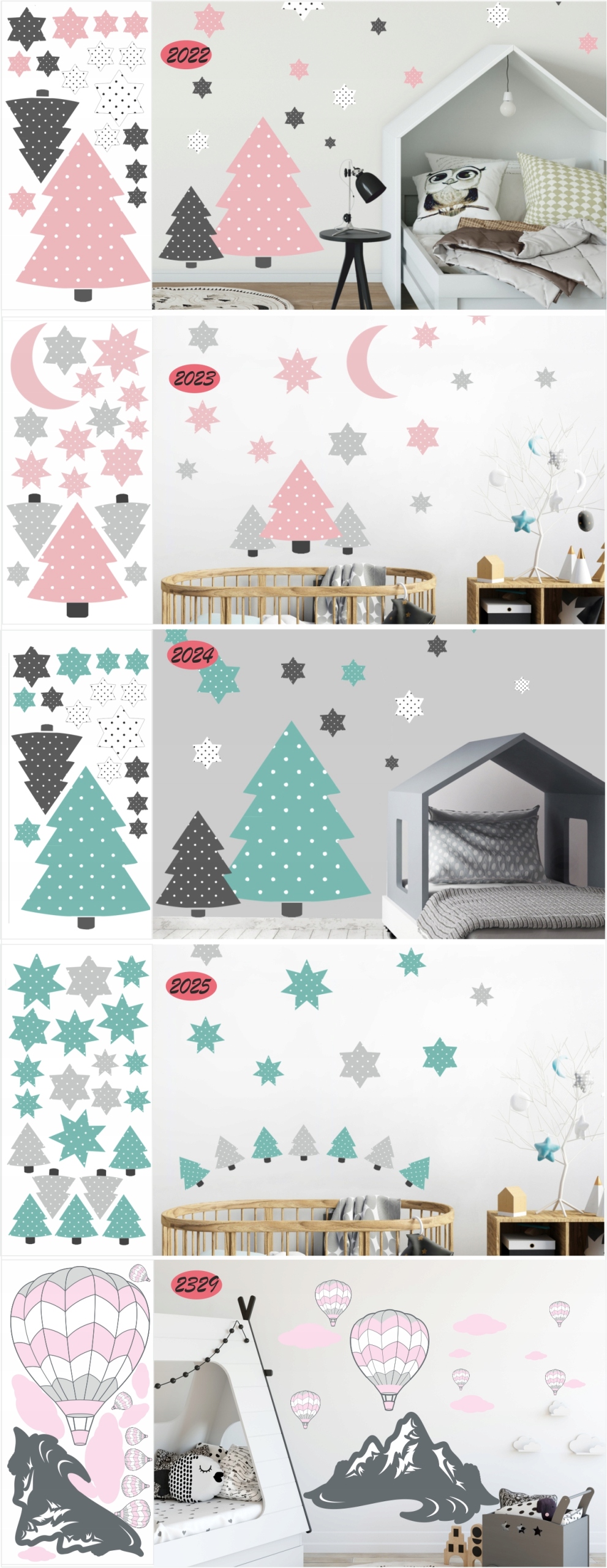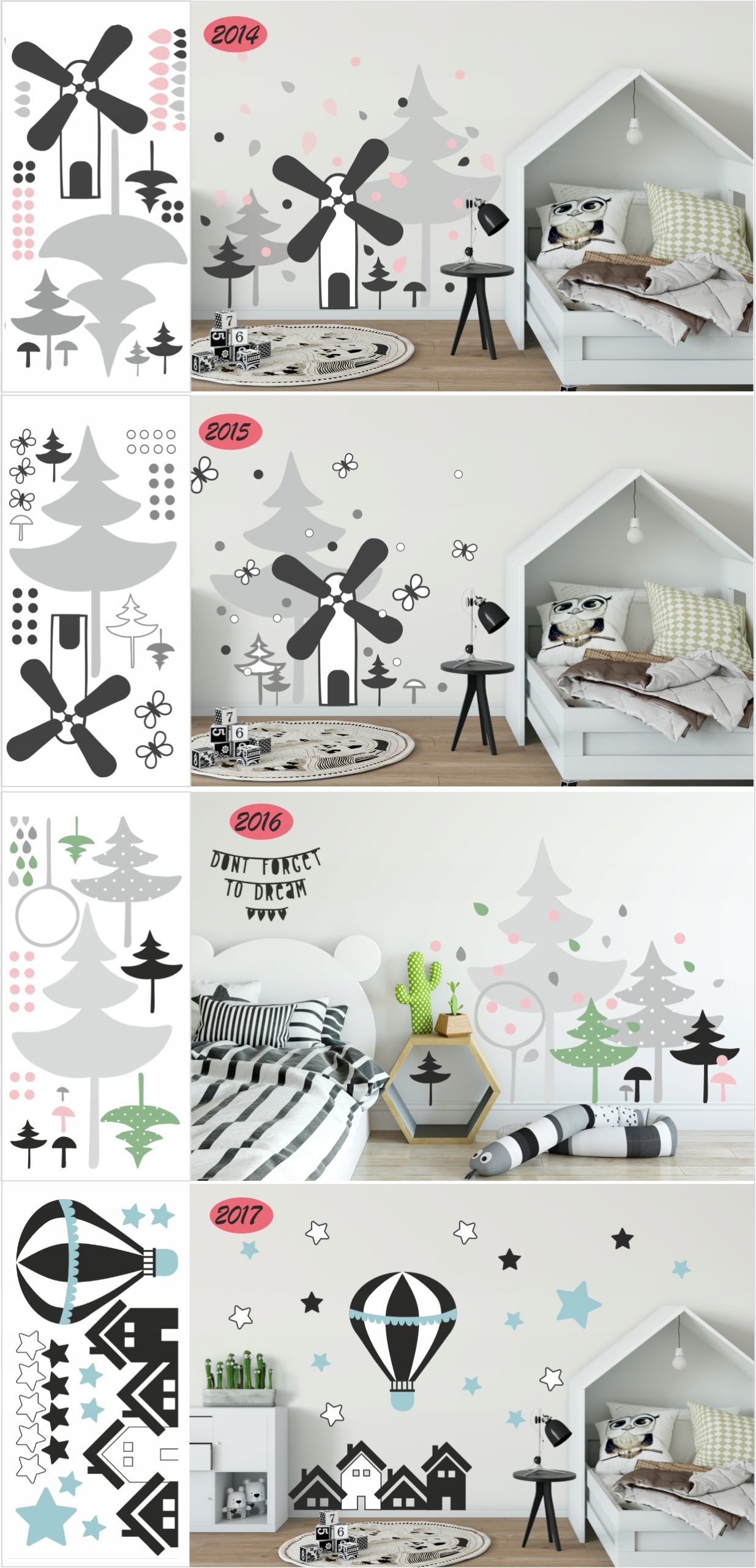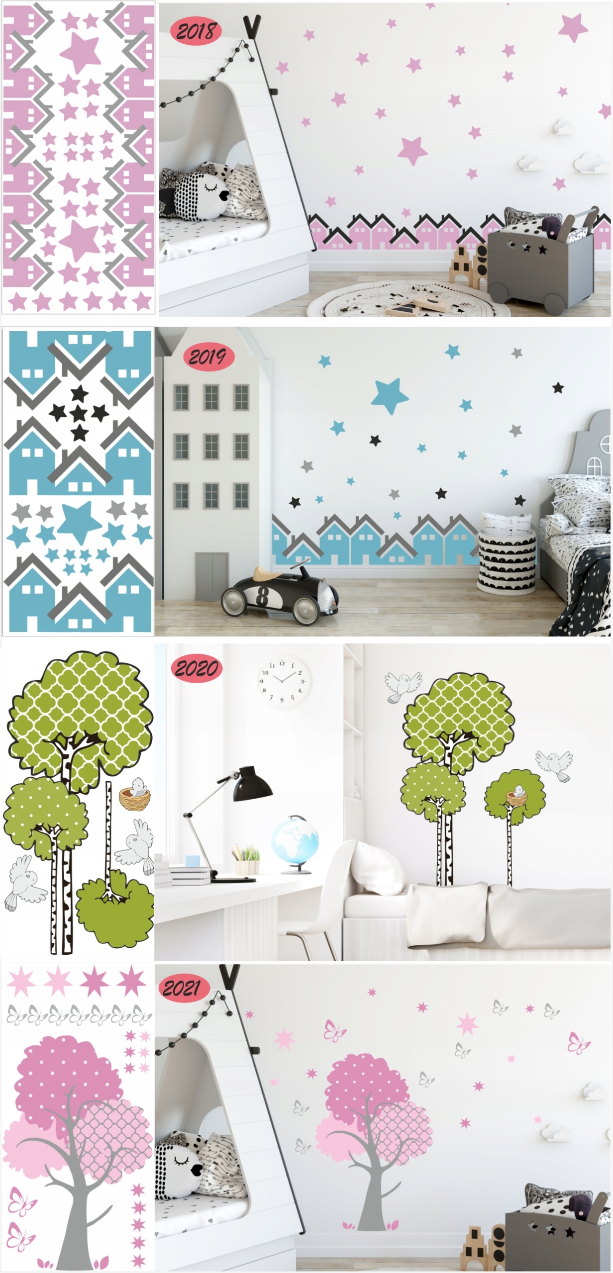 Naklejki mają żywe kolory, tusze których używam spełniają normy dla zabawek dla dzieci jak również na tapety do wnętrz.