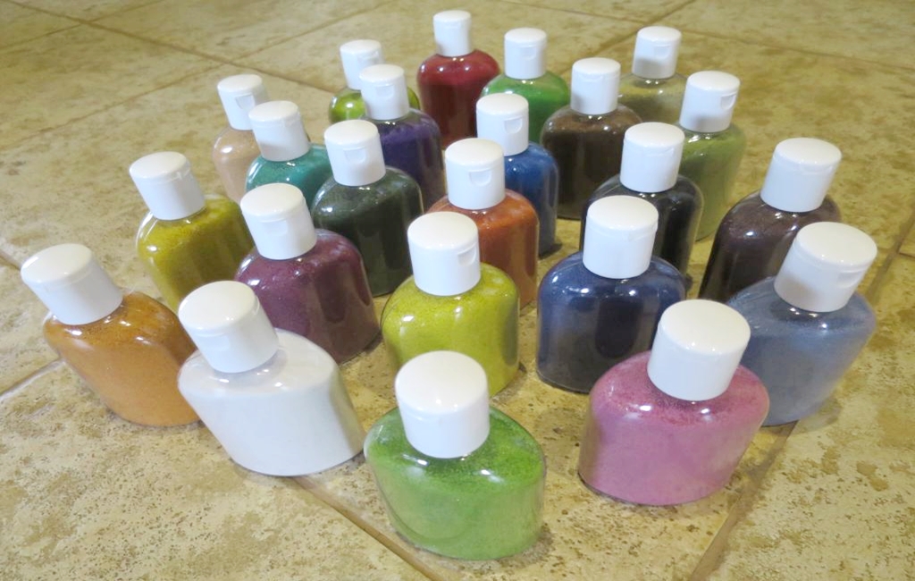 PIASEK KWARCOWY BARWIONY Fi 0,1-0,4 mm w plastikowej butelce z zamykanym dozownikiem , idealny do kolorowanek.